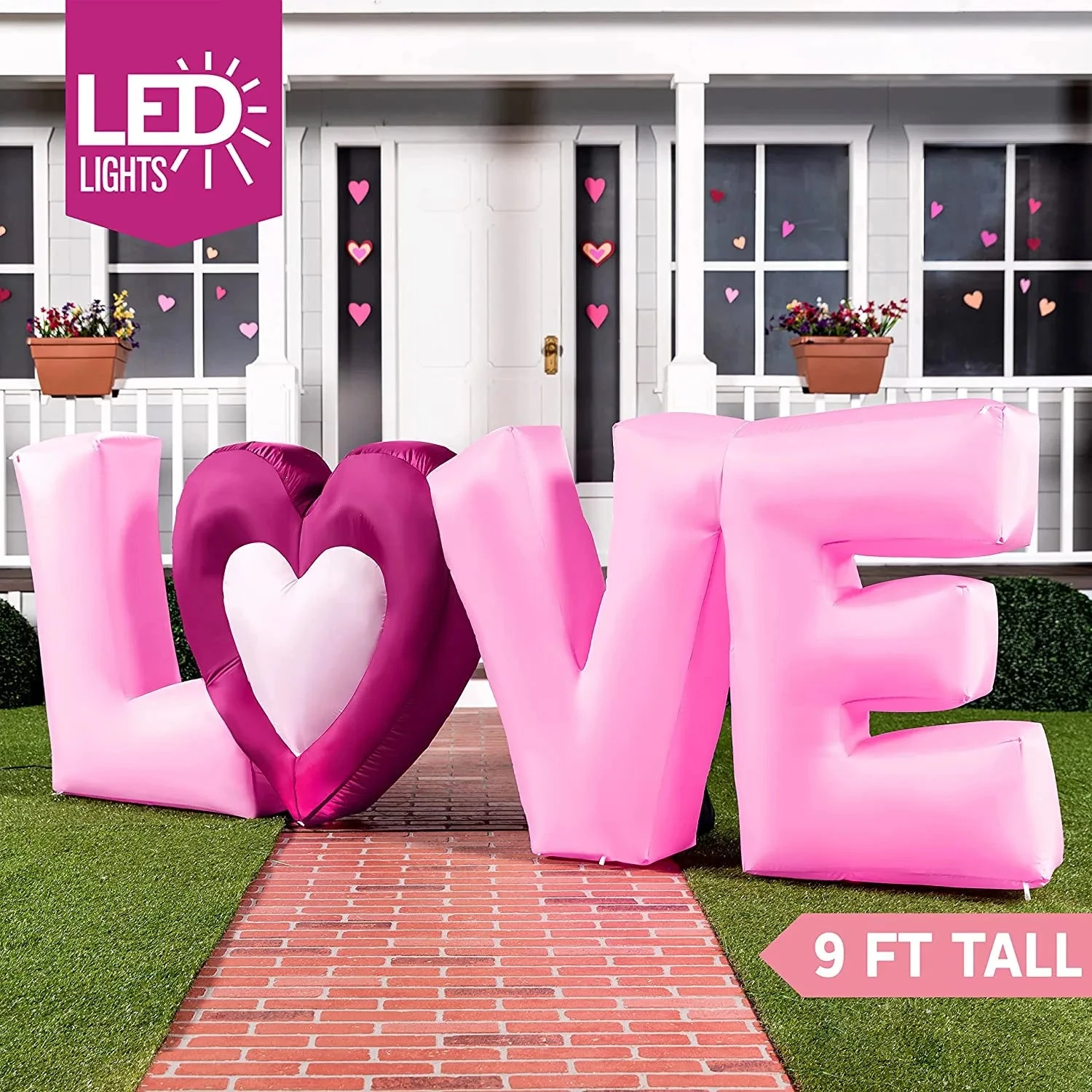 - Our 9 feet love letters inflatable comes with an extended cord, ground stakes, fastened ropes, built-in sandbags, built-in LED lights, and a plug with UL certification.