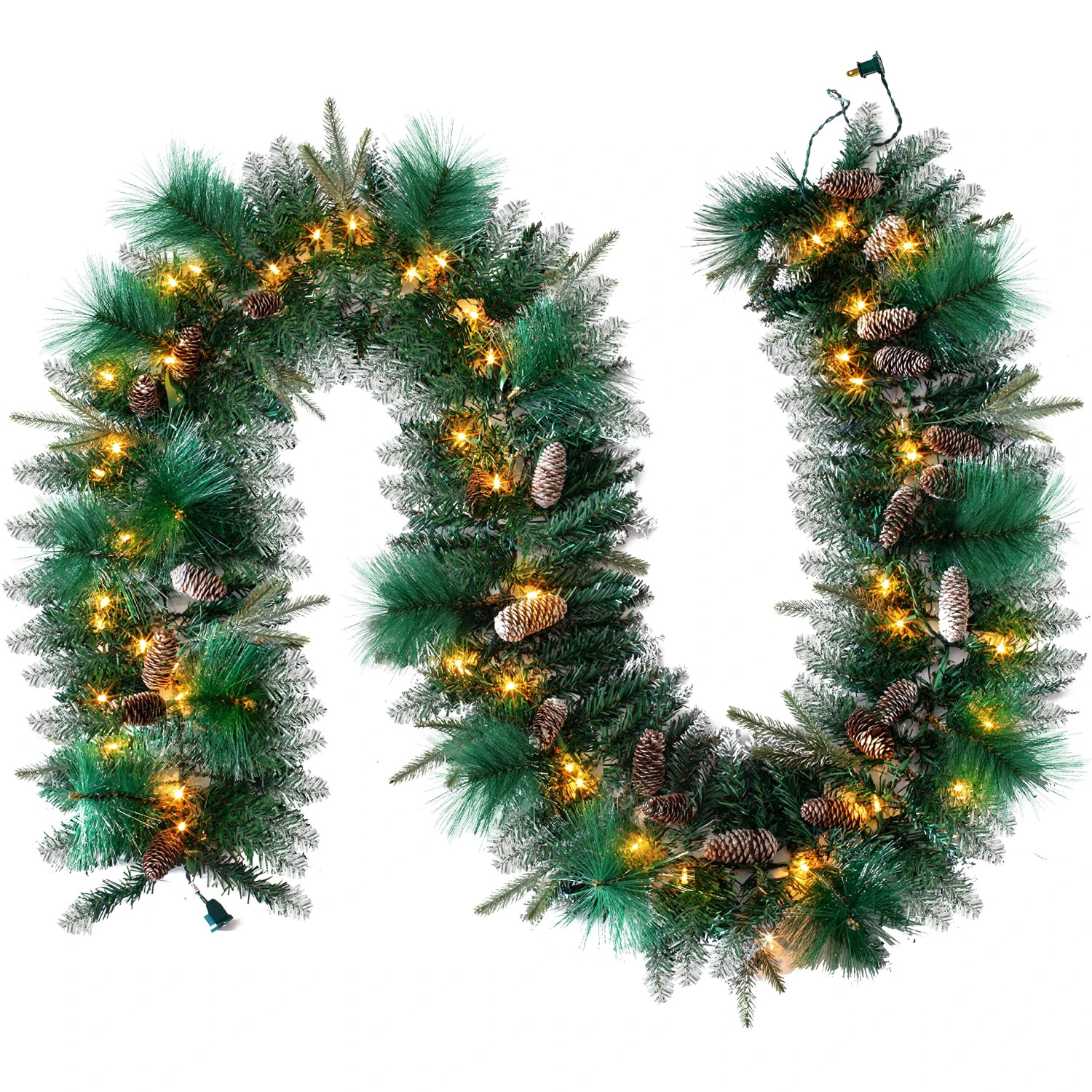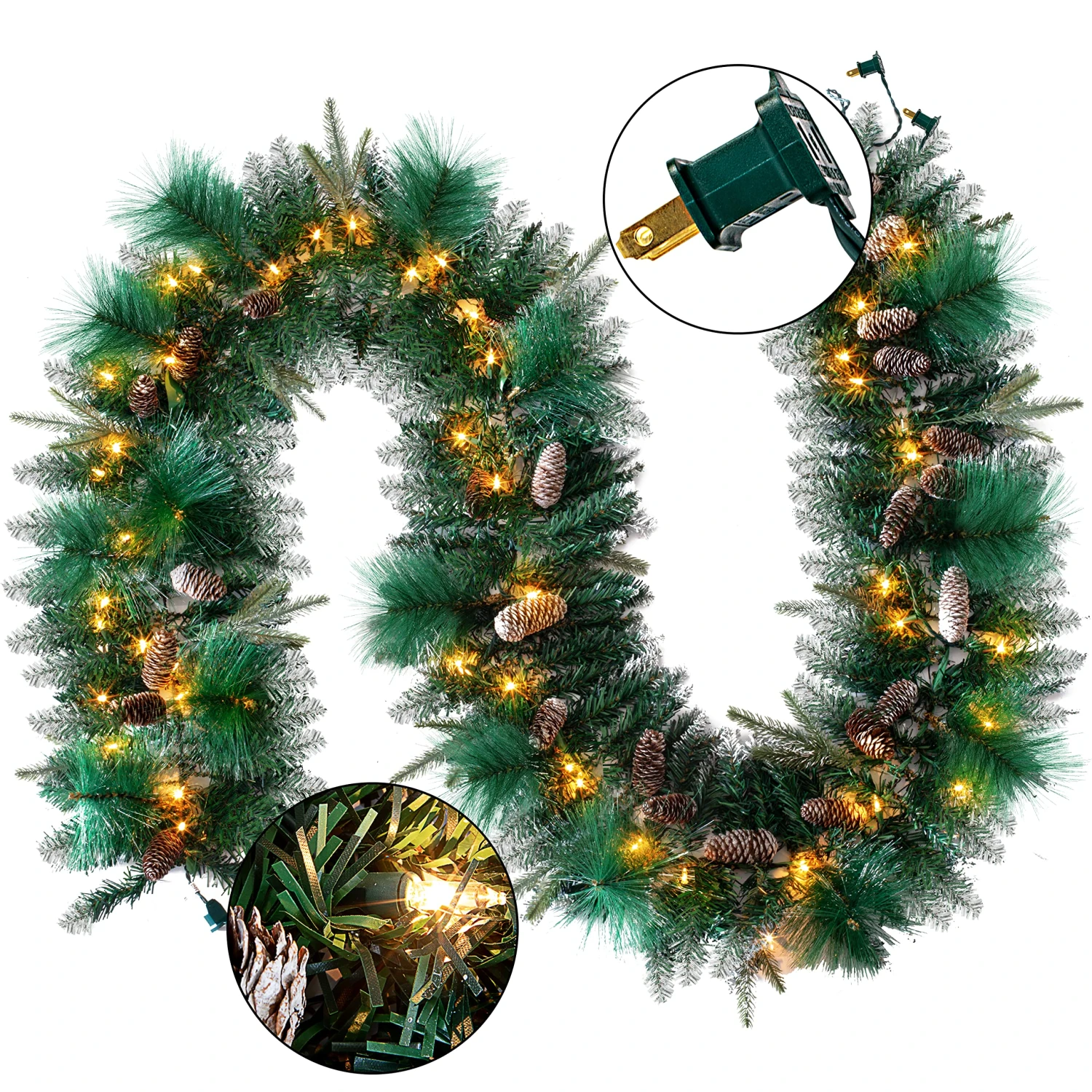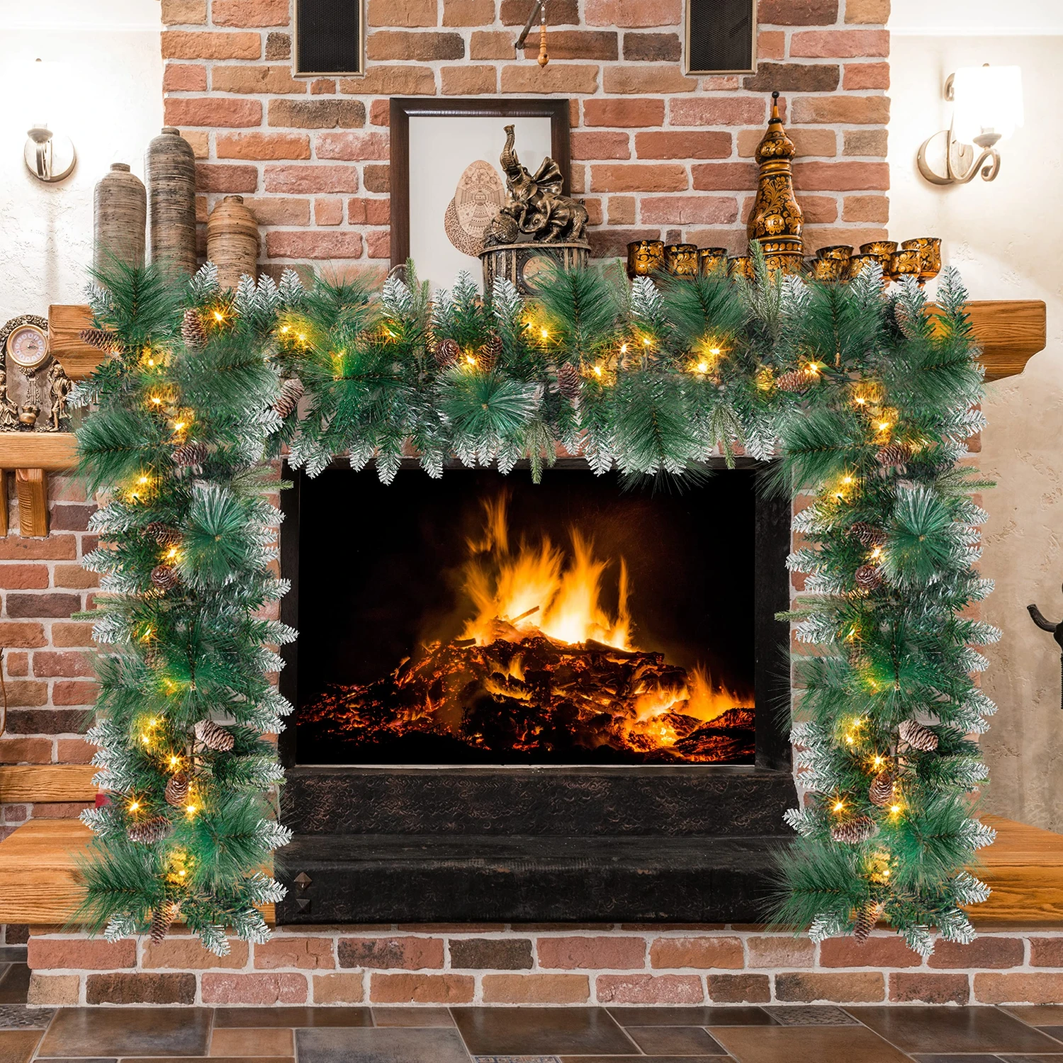 - Our Christmas lighted garland includes a 9ft Christmas flocked garland with pine cones, prelit garland with 50 led warm white string lights. This Christmas mantle garland will make your Christmas set-up extra-warm, lit and joyful.
