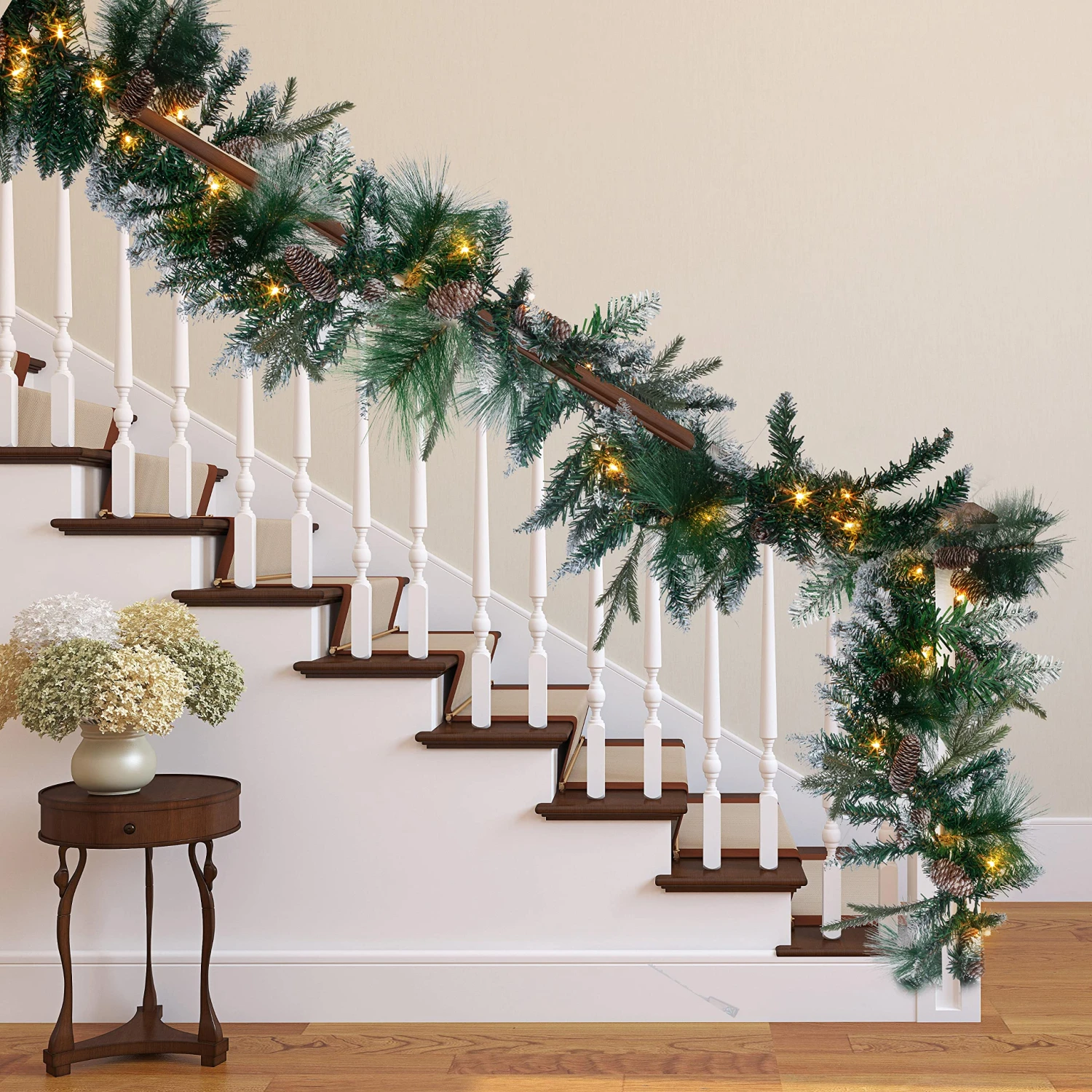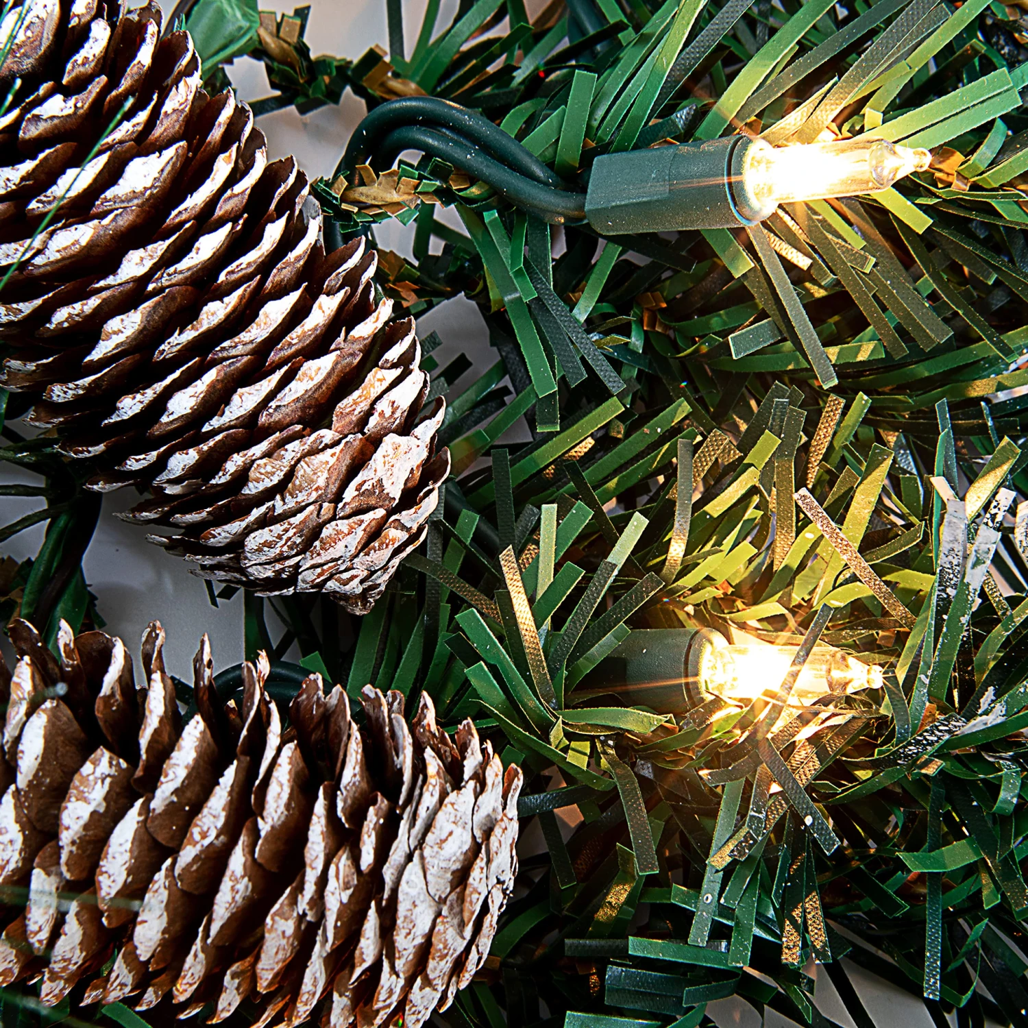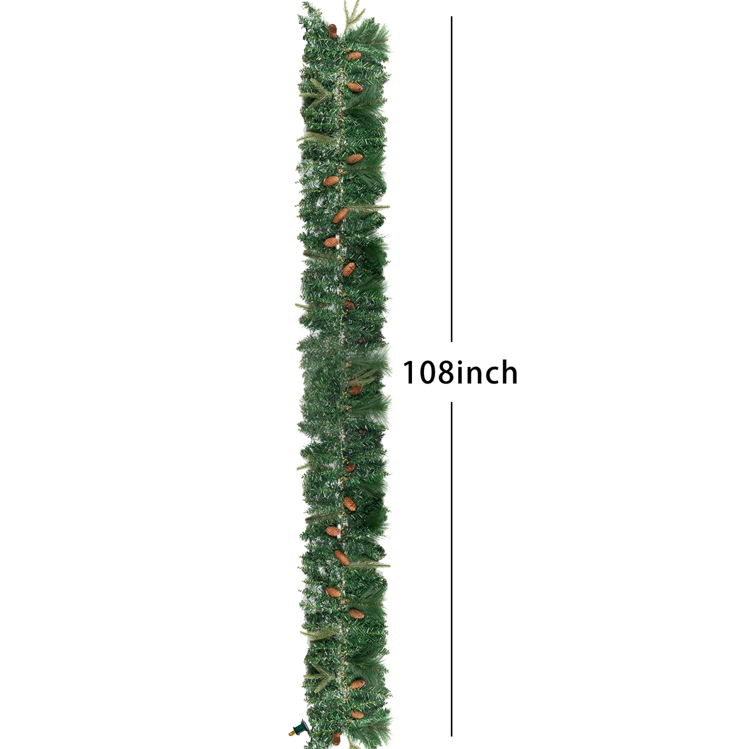 - Our Christmas lighted garland includes a 9ft Christmas flocked garland with pine cones, prelit garland with 50 led warm white string lights. This Christmas mantle garland will make your Christmas set-up extra-warm, lit and joyful.