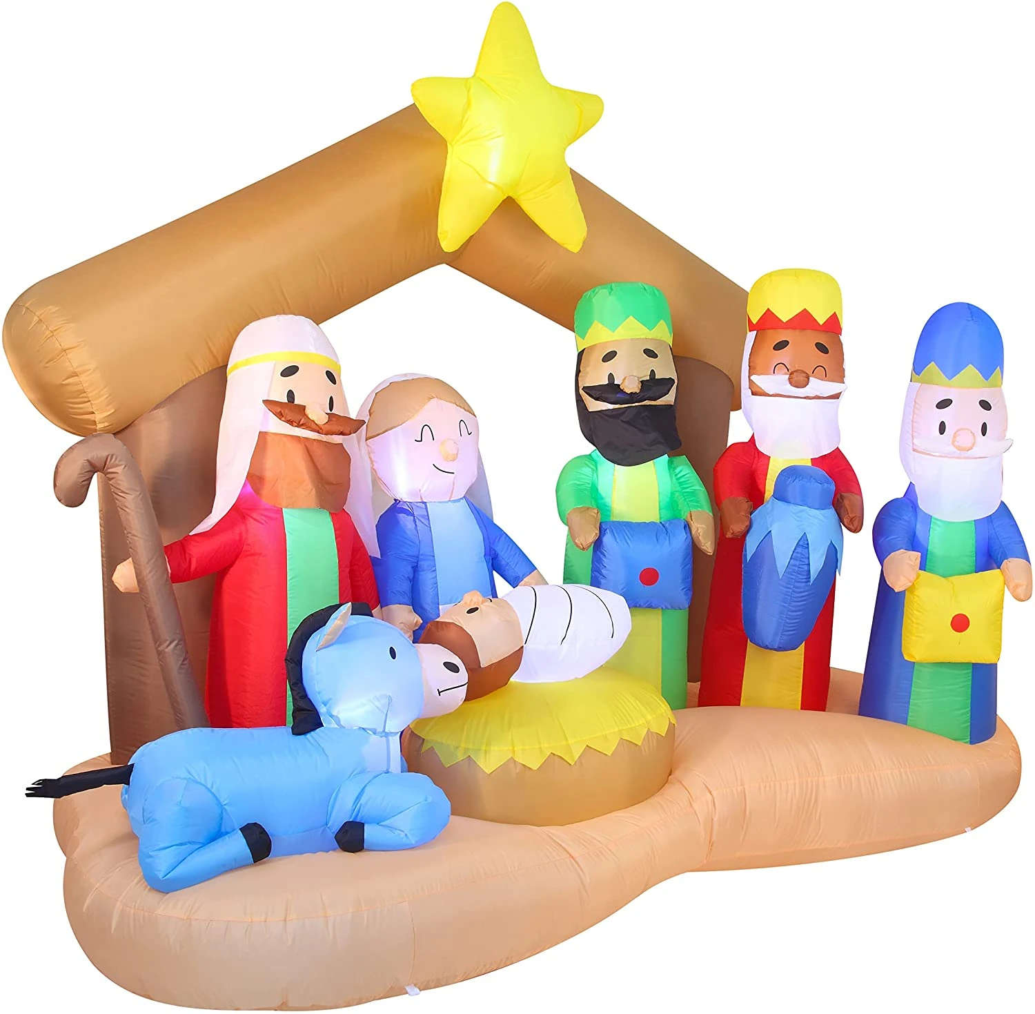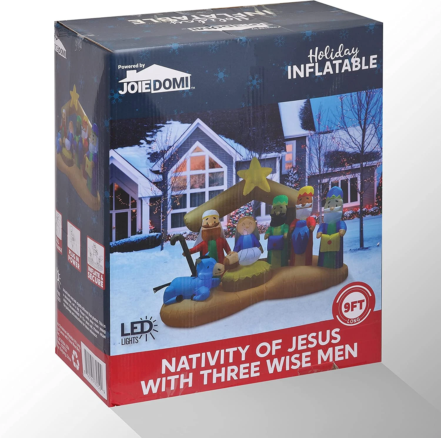 - 9 Feet Long Nativity Of Jesus With Three Wise Men Inflatable comes with an extended cord, ground stakes, fastened ropes, built-in sandbags, and a plug with UL certification.