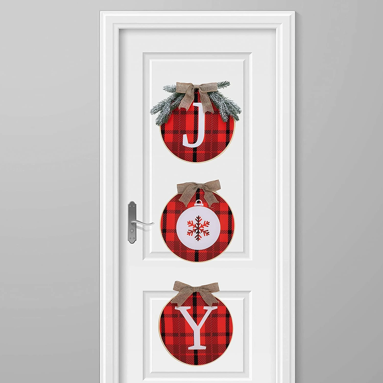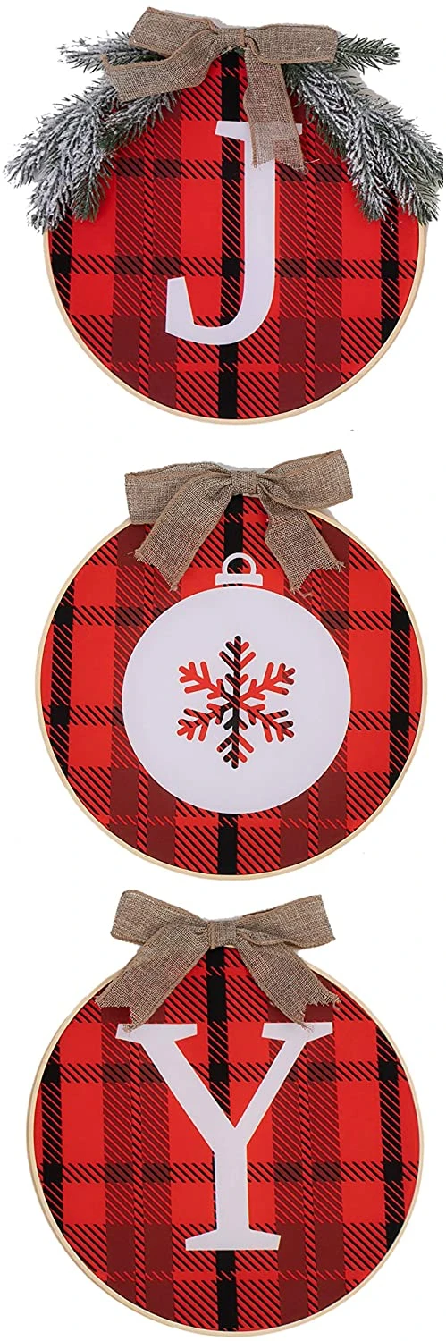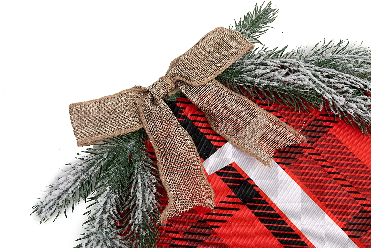 - XMAS DECOR: JOYIN 12” Christmas plaid wreath with a rustic wooden burlap bow and pine leaves that comes with jute twine strings. Let’s make a great festive addition to your Christmas and holiday decoration.