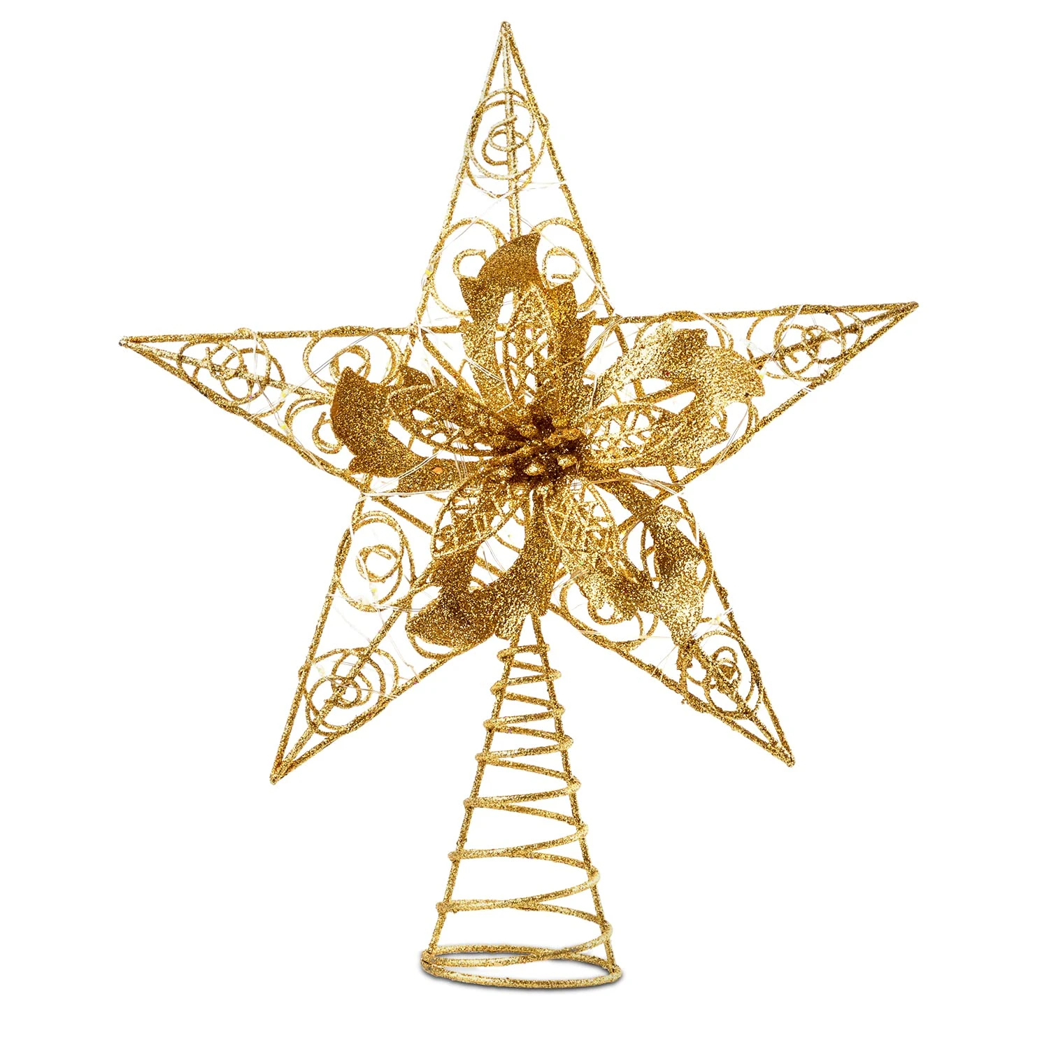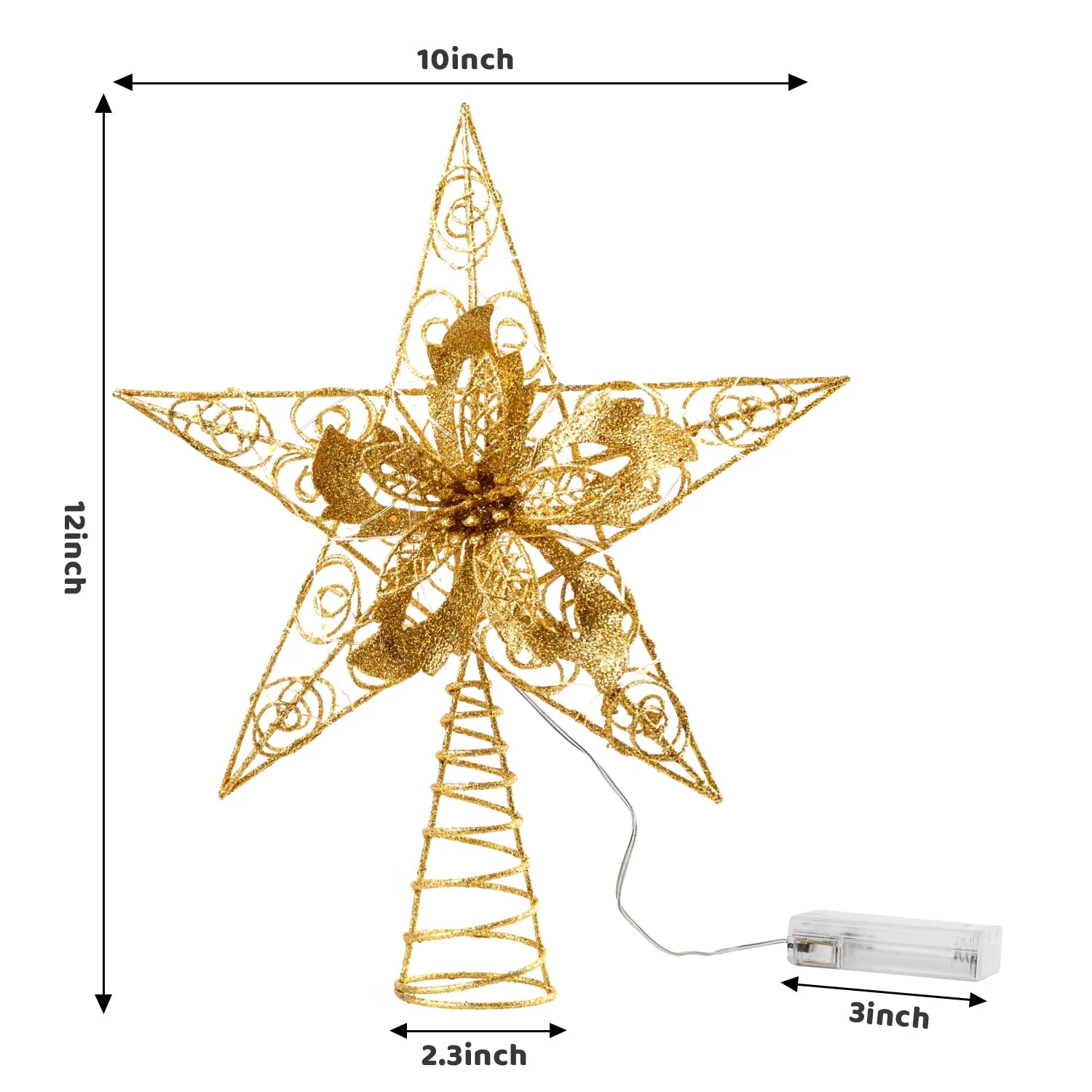 - Our Christmas tree topper adopts a traditional 5-pointed gold flower star lighted with warm white LED lights. An ideal choice to decorate your christmas tree! The gold star flower tree topper in a size 8 inch * 10 inch, which is perfect fit for a 6ft to 7ft xmas tree.