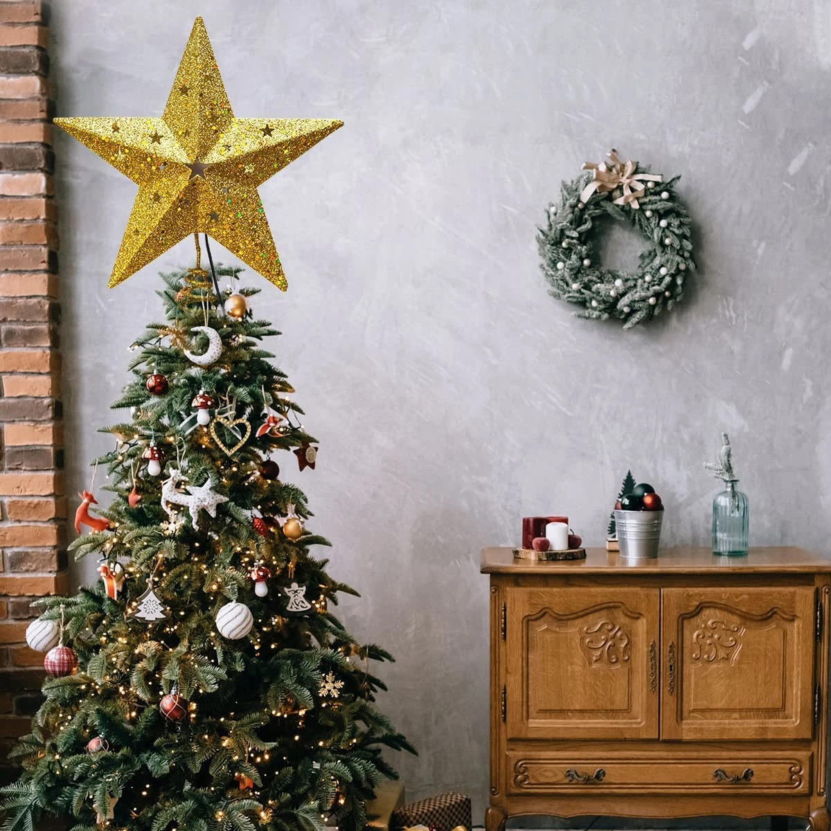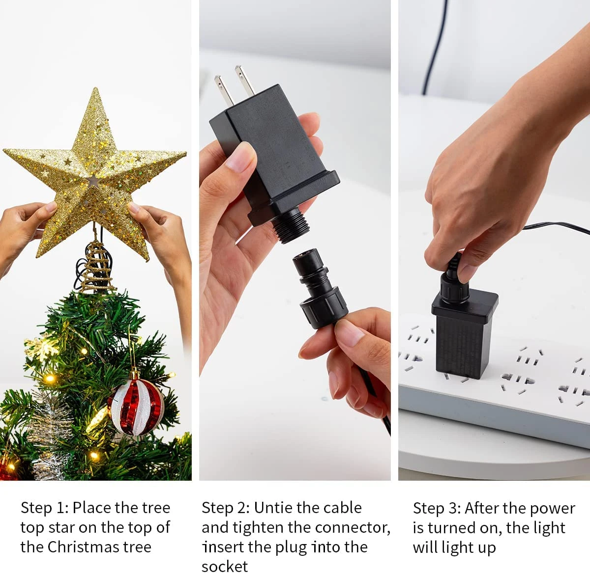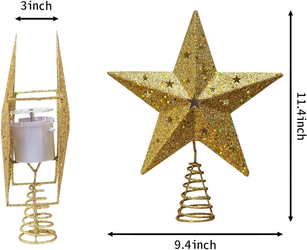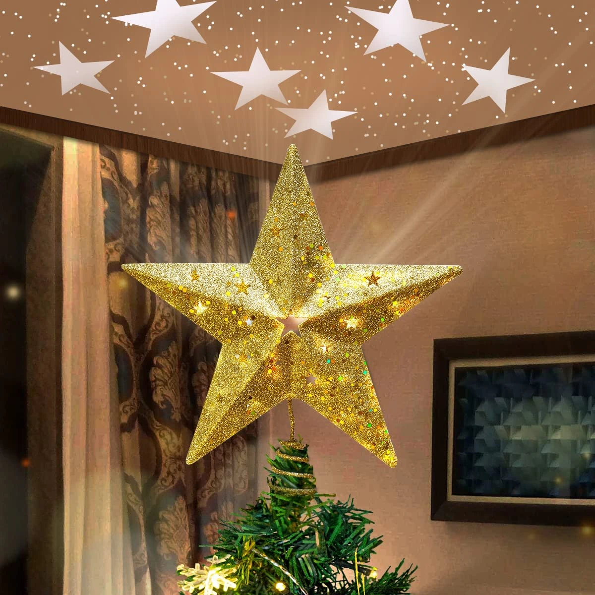 - UNIQUE DESIGN. This hollow-out Star Tree Topper is perfectly coated in Gold. Also, this is intricately detailed with a double sided cutout design within the center of each of the 8 points with White Star Projector. Once lighted, there would be countless White Stars shining around!