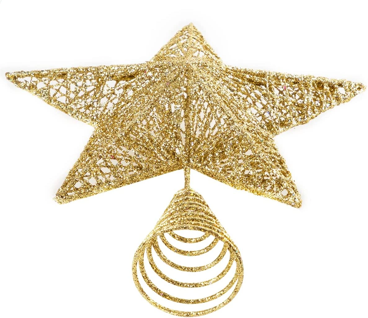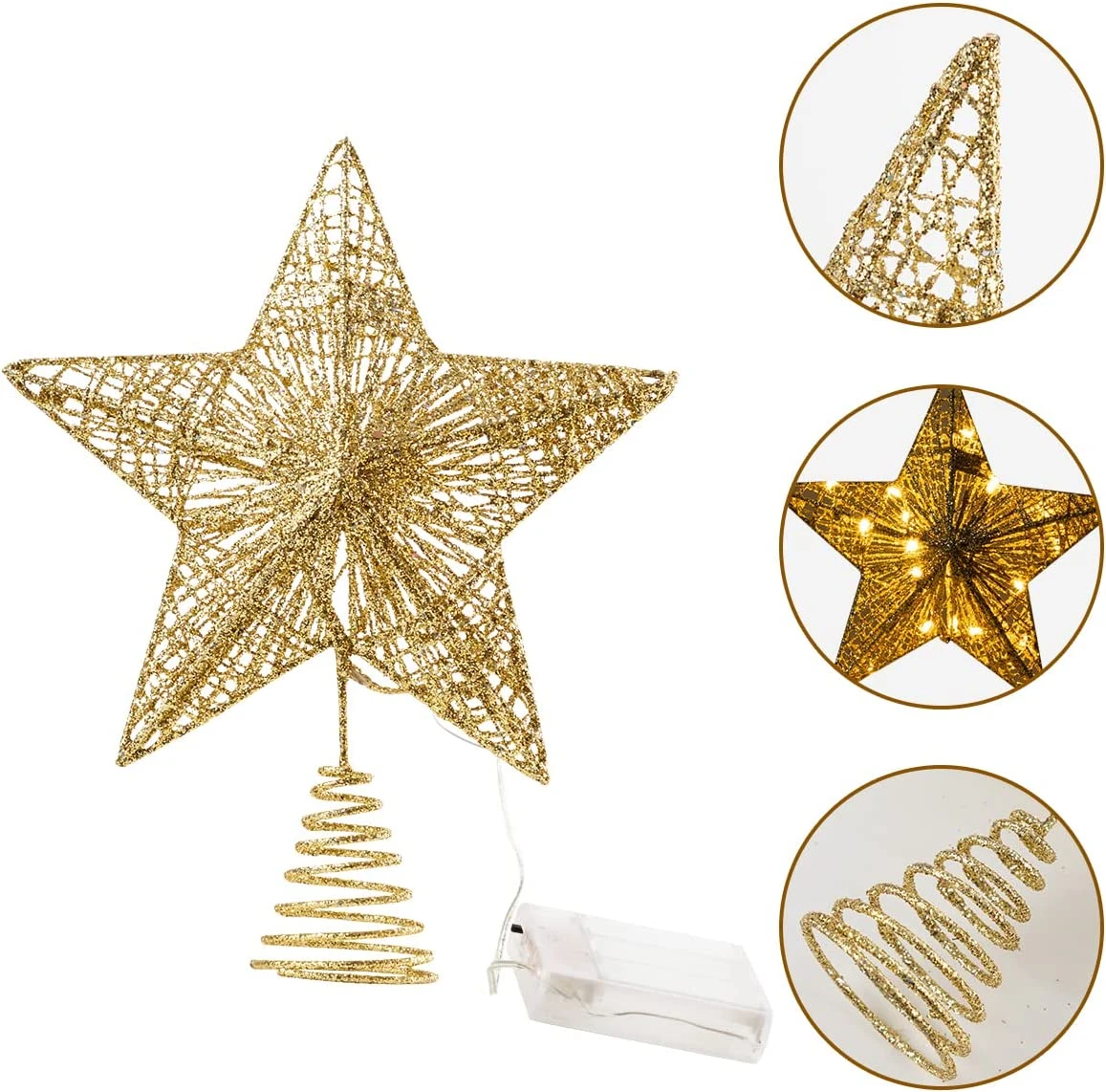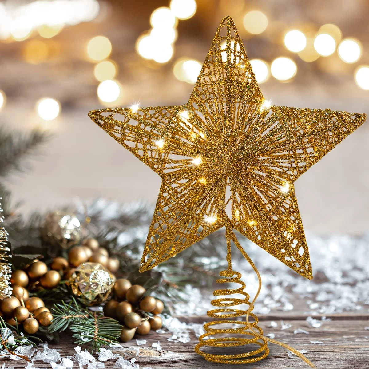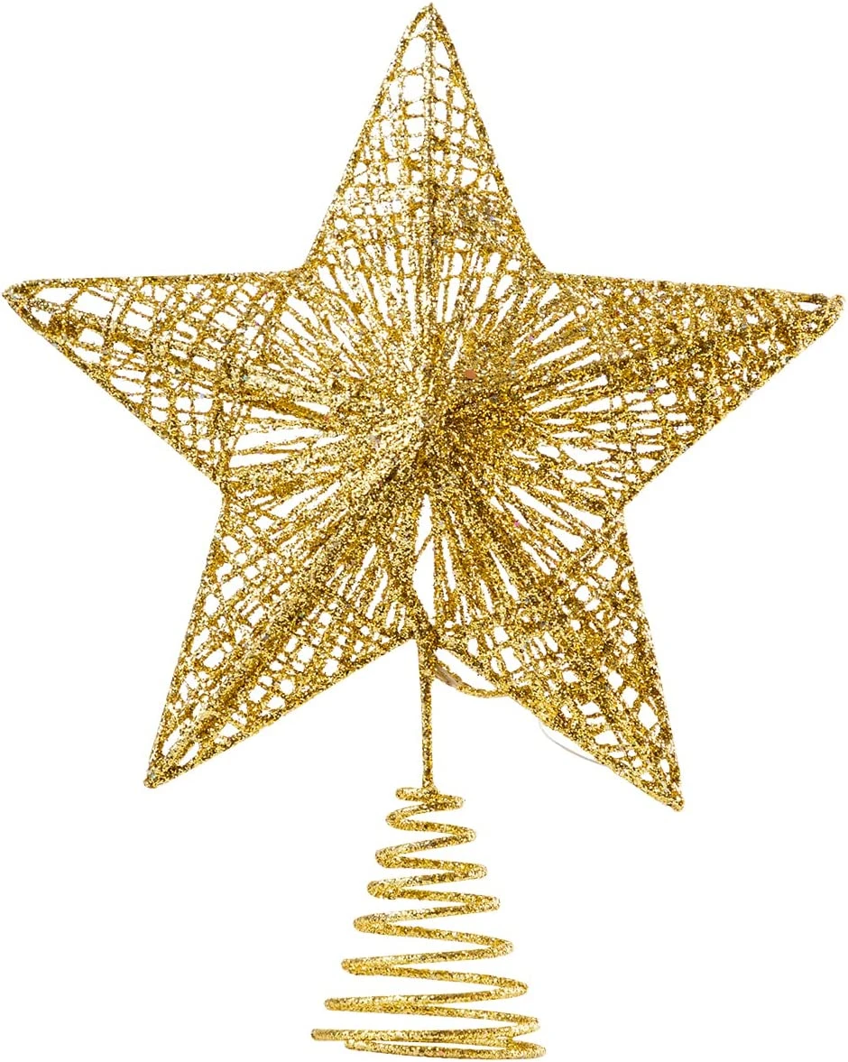 - This Star Tree Topper is perfectly coated in Gold with a shining glitter around it. When the built-in Warm White LED is lighted, its glittery coat does shine brightly along with the lights.