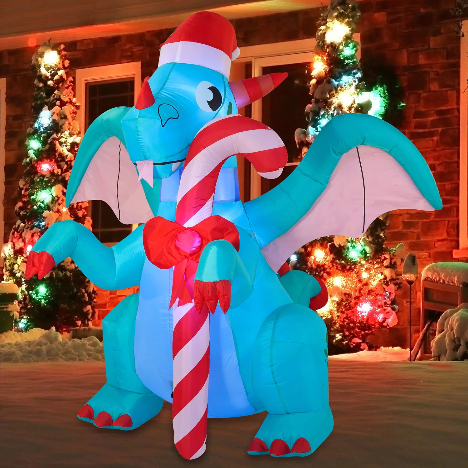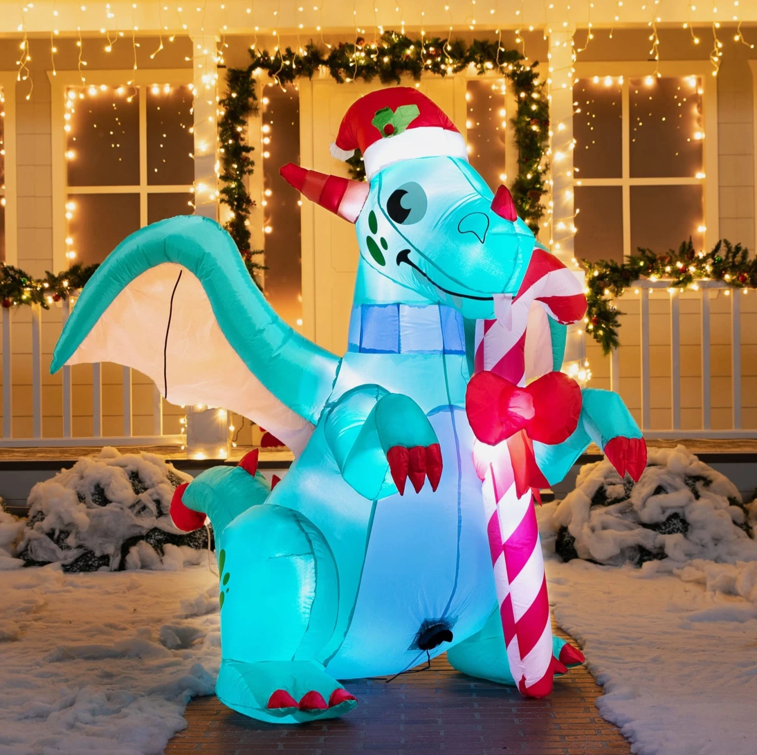 - Green Dragon with a Candy Cane Inflatable comes with an extended cord, ground stakes, fastened ropes, built-in sandbags, and a plug with UL certification.
