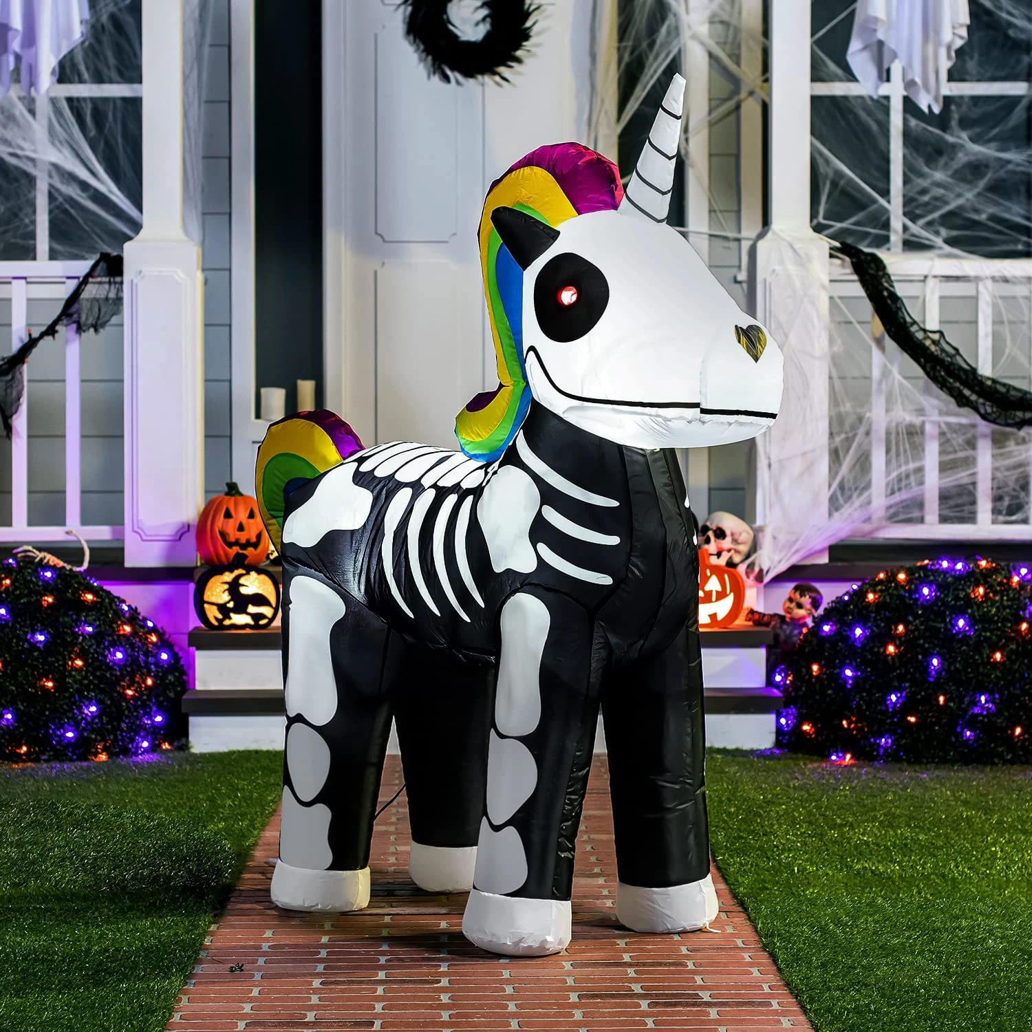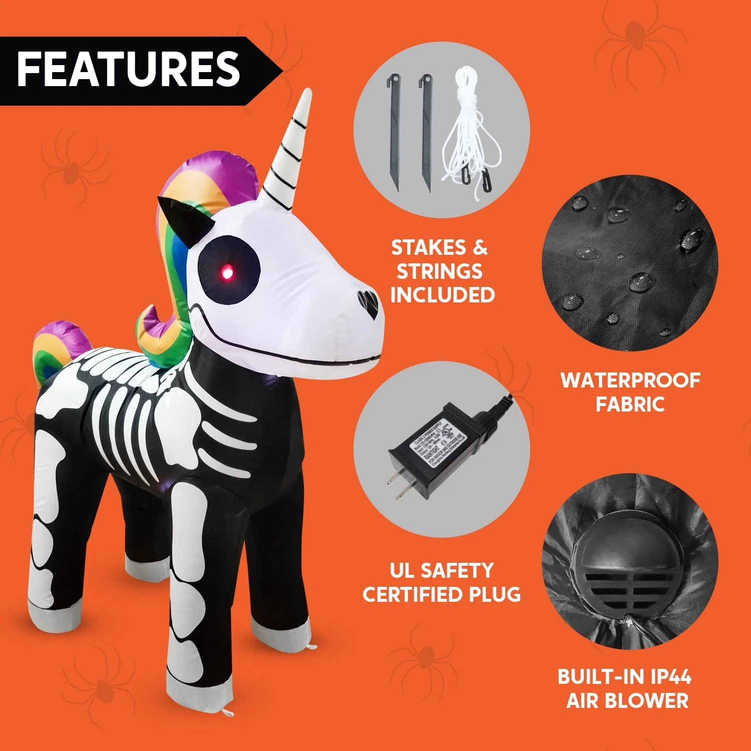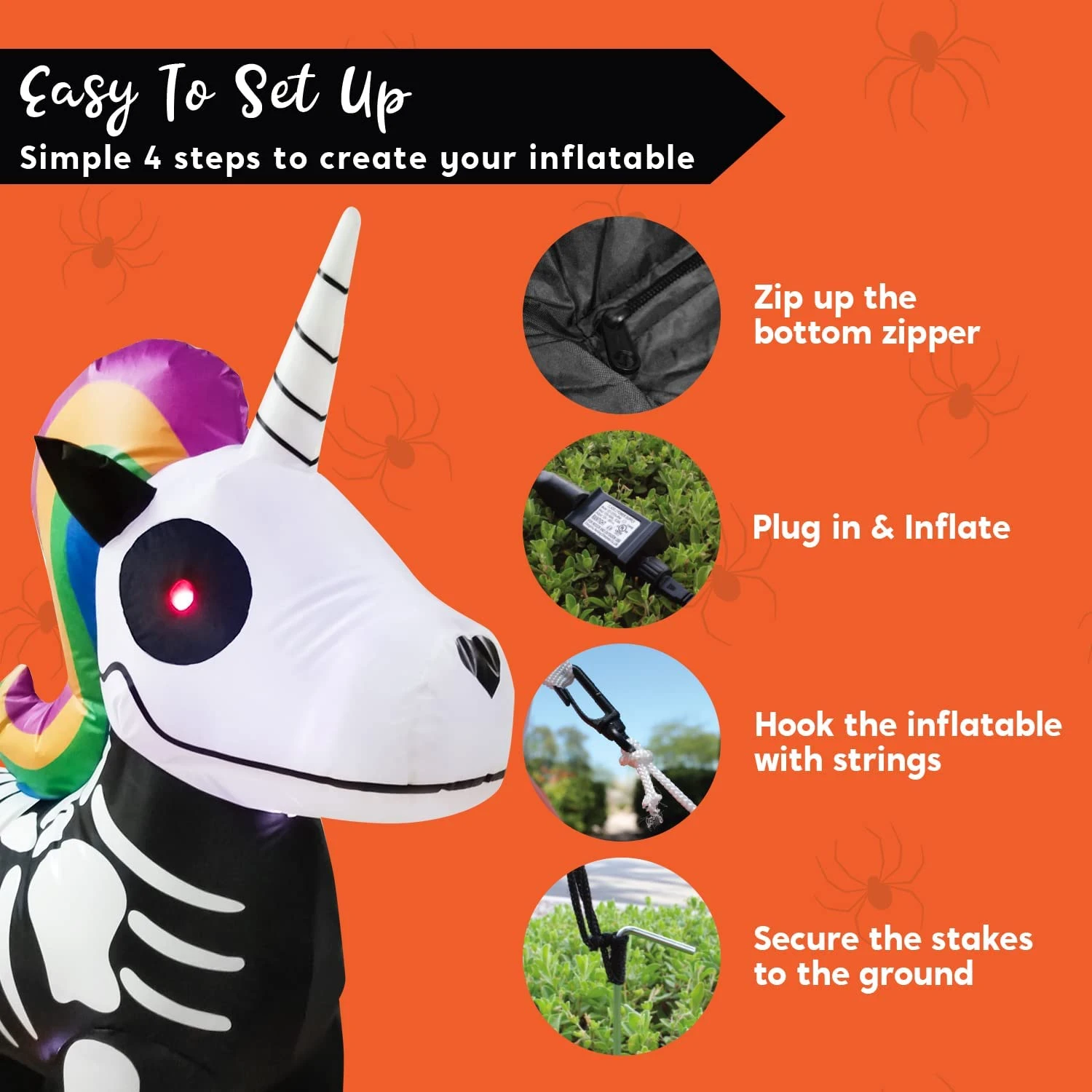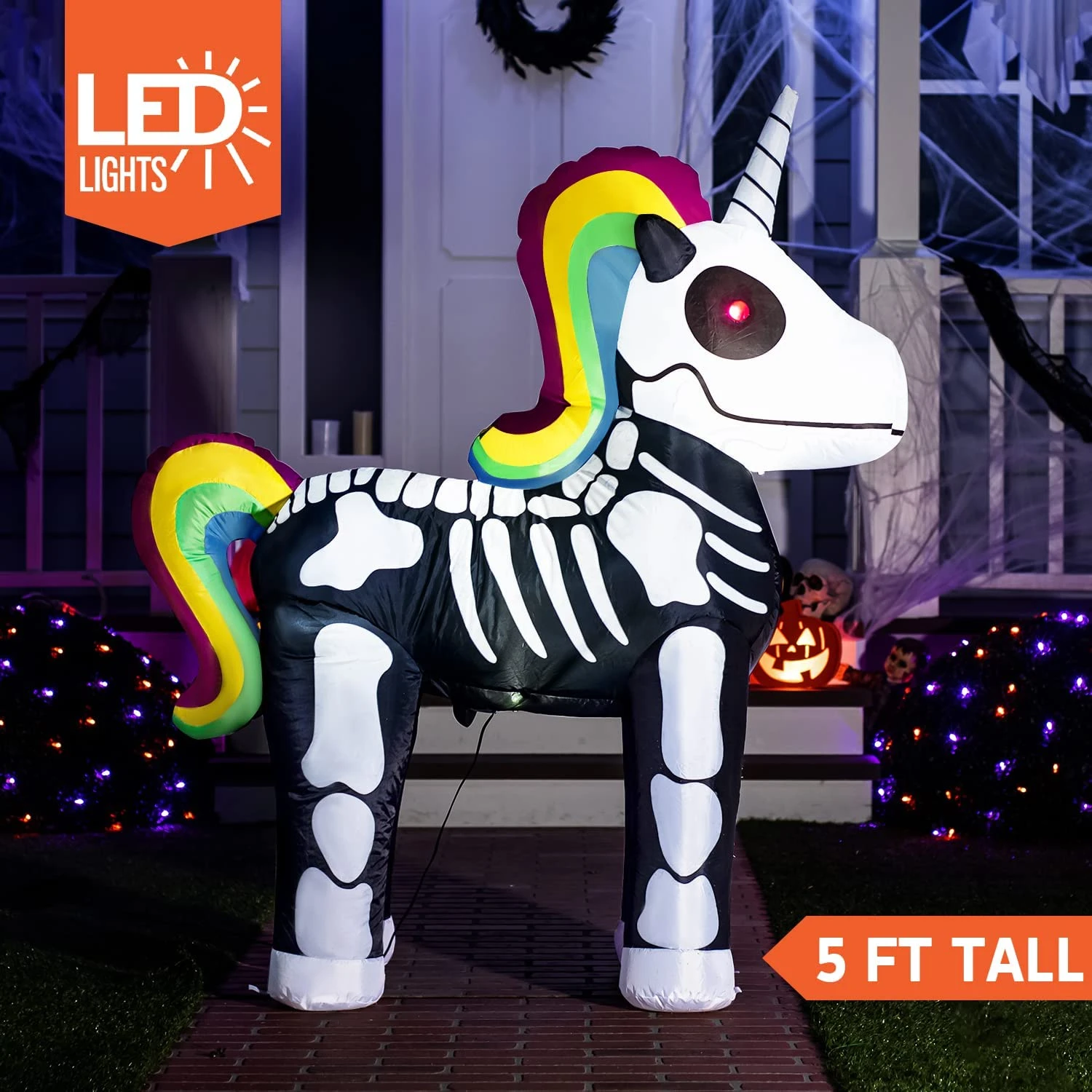 - Our 5 FT tall-standing skeleton unicorn inflatable comes with extended cords, ground stakes, fastened ropes, built-in sandbags, and a plug with UL certification.