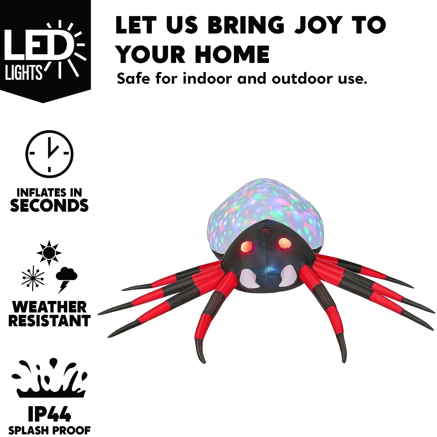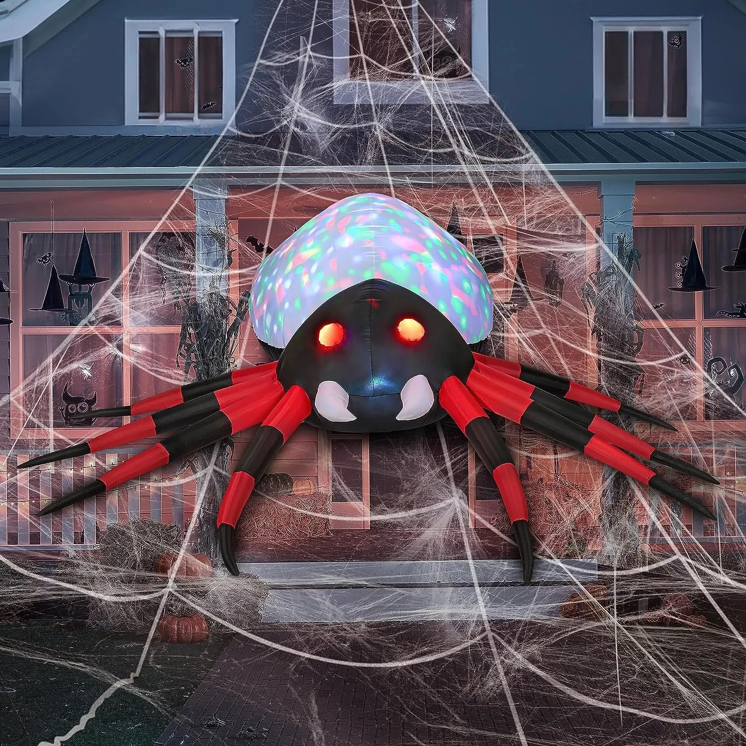 - Excellent Design. This 12ft Halloween inflatable spider decoration boasts a striking design that is sure to grab attention. With its large size and intricate details, it adds a spooky touch to any Halloween display. The rotating colorful lights create a novel and unique visual effect. This inflatable comes with an extended cord, ground stakes, fastened ropes, built-in sandbags, and a plug with UL certification.
