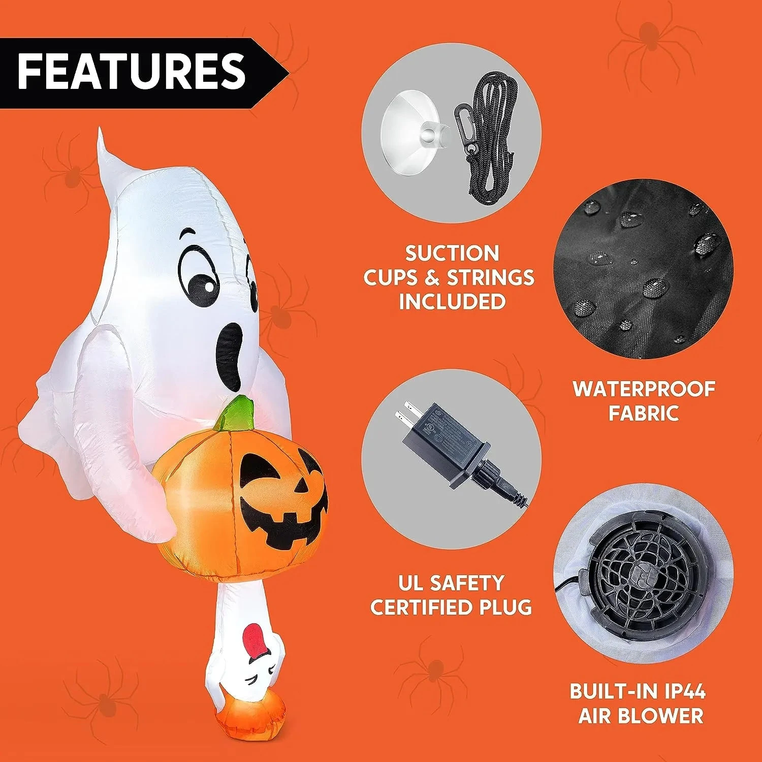 Excellent Design: The 4.5ft Cute Ghost Steal Pumpkin Window Breaker Inflatable Decoration showcases an outstanding design that combines novelty and cuteness. With its adorable ghost stealing a pumpkin, a panicked expression, it brings a whimsical and playful touch to your Halloween setup.This inflatable comes with an extended cord, suction cups, fastened ropes, built-in sandbags, and a plug with UL certification.