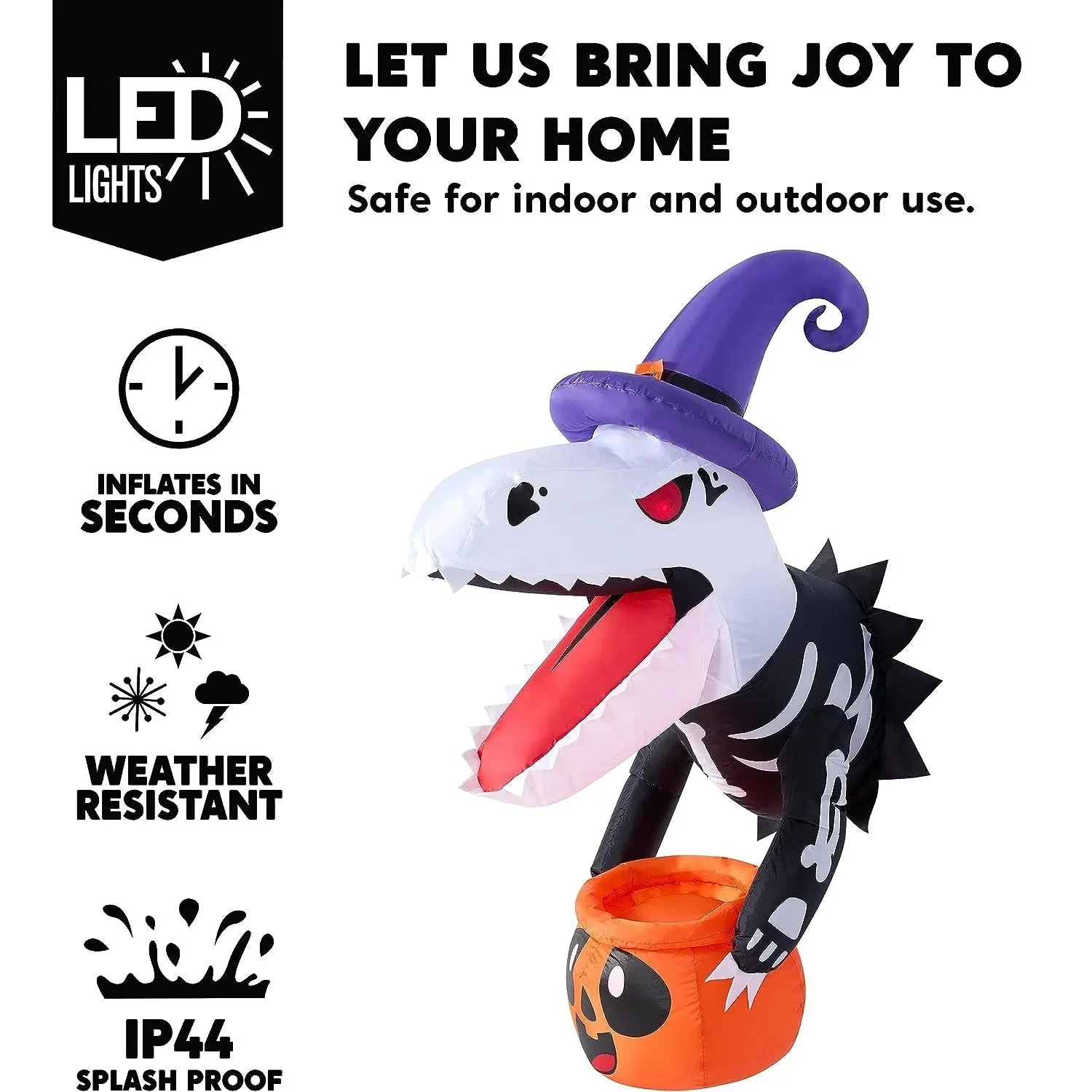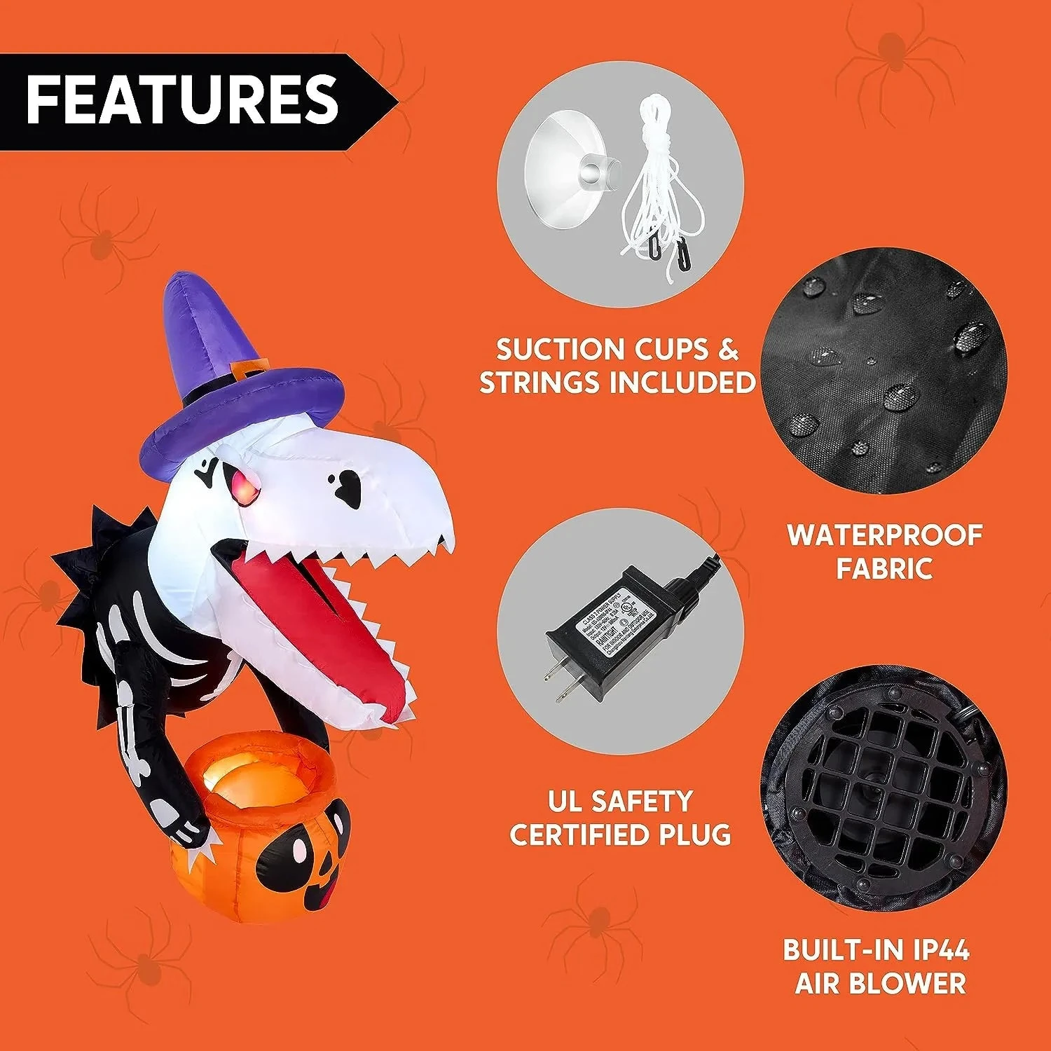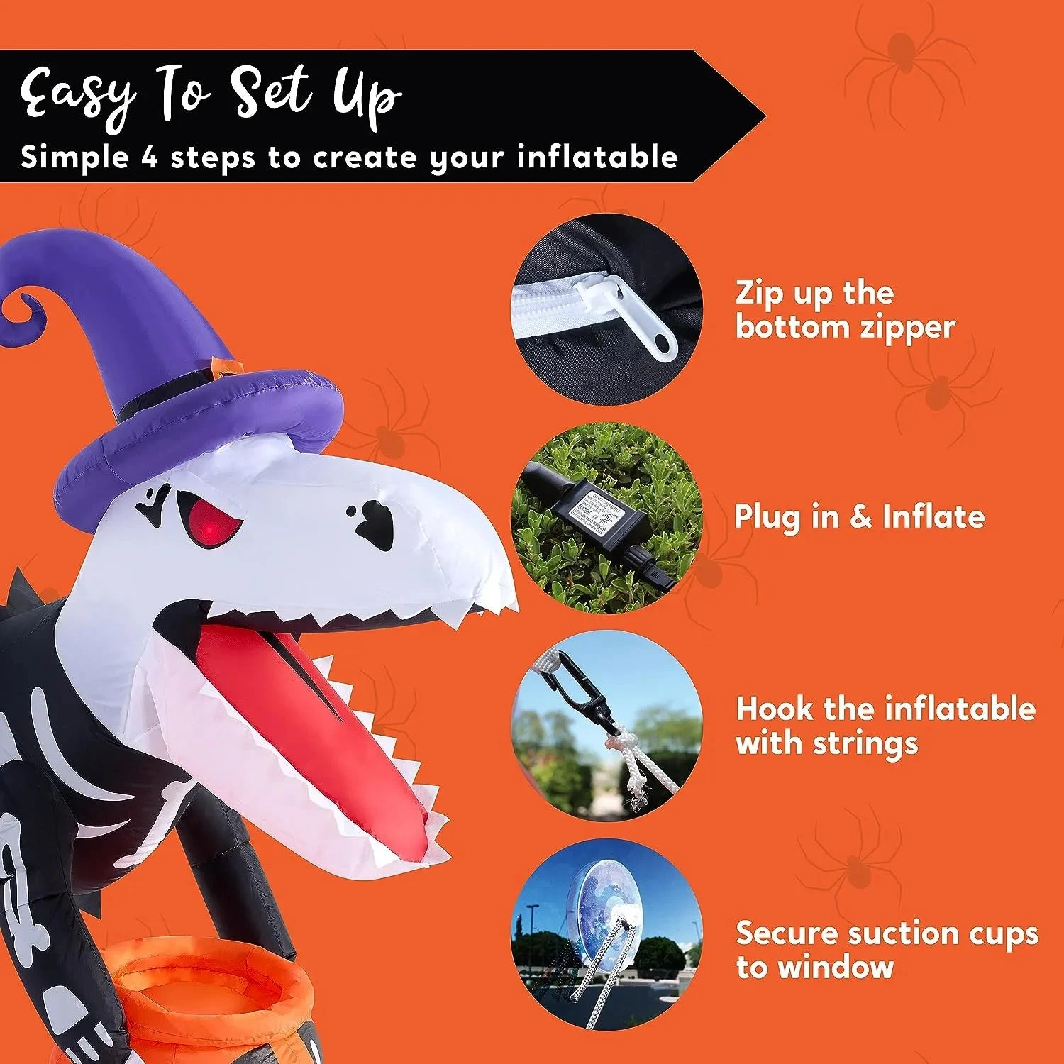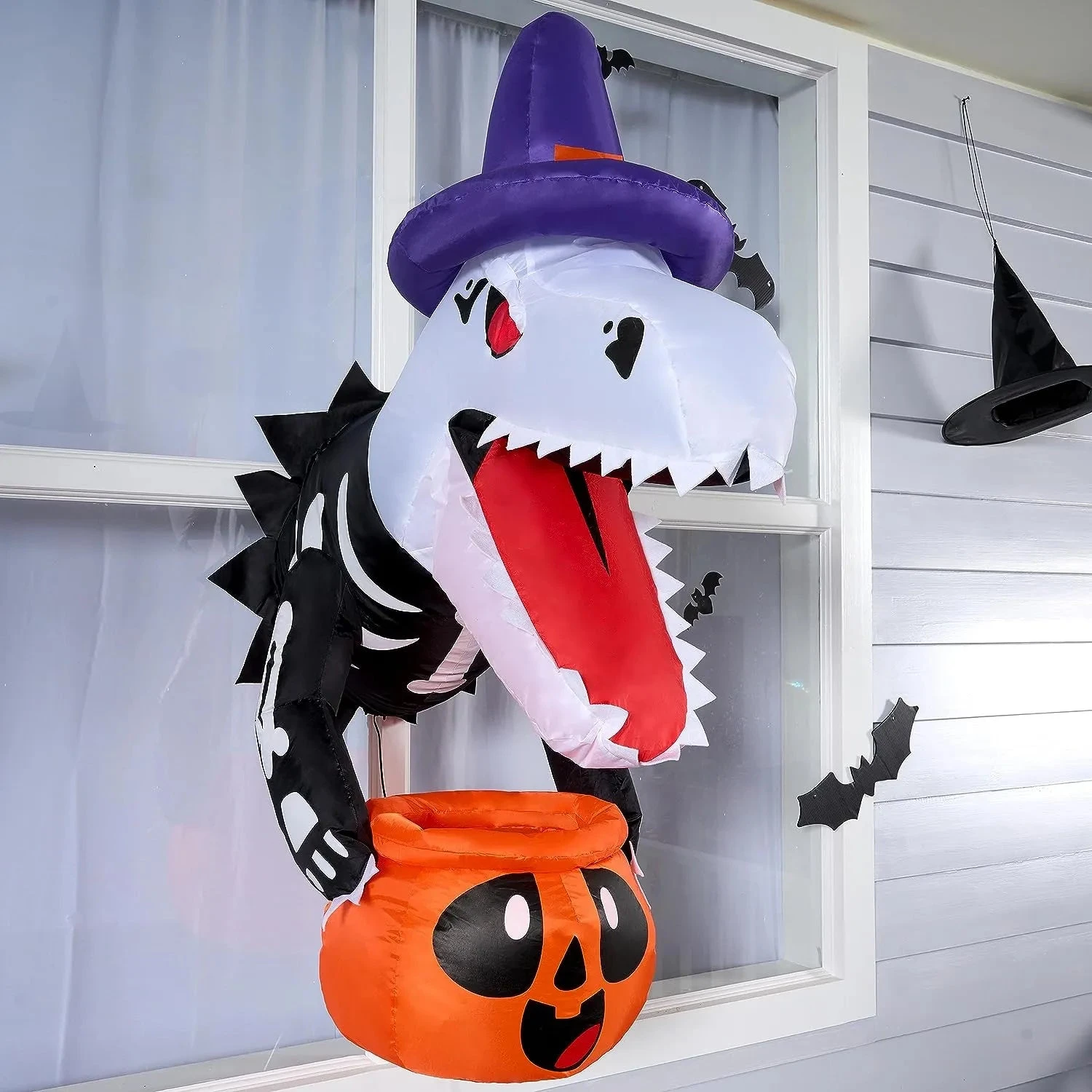 - Excellent Design: This Halloween inflatable dinosaur broke out from window. With its witch hat, pumpkin candy basket, it creates a striking and eerie visual display that will impress and delight your Halloween guests. This inflatable comes with an extended cord, ground stakes, fastened ropes, built-in sandbags, and a plug with UL certification.