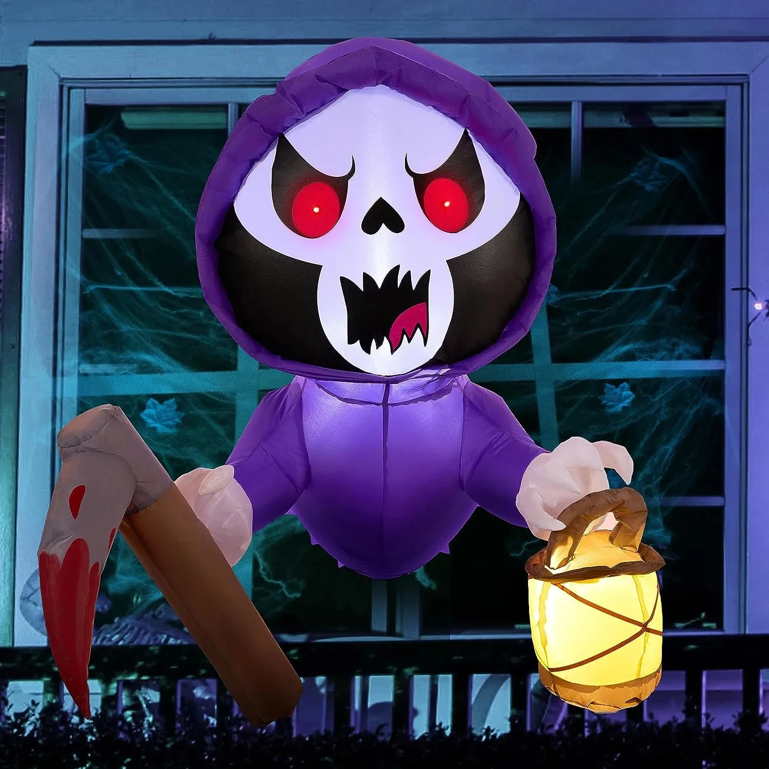 Excellent Design. This Halloween Blow up Grim Reaper window breaker with an impressive 4.5ft tall, its detailed design showcases the Grim Reaper broke out from the window with lantern and scythe in hand. The red LED lights in the eyes and the yellow LED lights in the lantern create a hauntingly realistic and visually striking display. This inflatable comes with an extended cord, suction cups, fastened ropes, and a plug with UL certification.