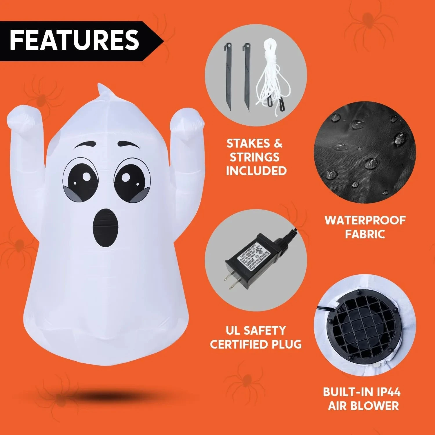 - Excellent Design. This 5 ft inflatable cute floating ghost is designed to captivate attention and spread Halloween cheer. Its adorable appearance will bring a smile to everyone’s face, making it a perfect addition to your festive decor. This inflatable comes with an extended cord, ground stakes, fastened ropes, built-in sandbags, and a plug with UL certification.