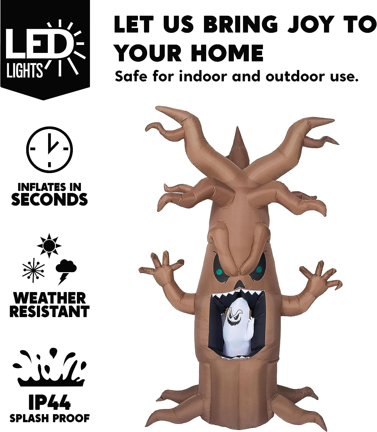 - PERFECT DESIGN: This 7ft Halloween inflatable tree with a swinging ghost and built-in LED lights is designed to add a touch of horror and spookiness to your outdoor decor. This inflatable comes with an extended cord, ground stakes, fastened ropes, built-in sandbags, and a plug with UL certification.