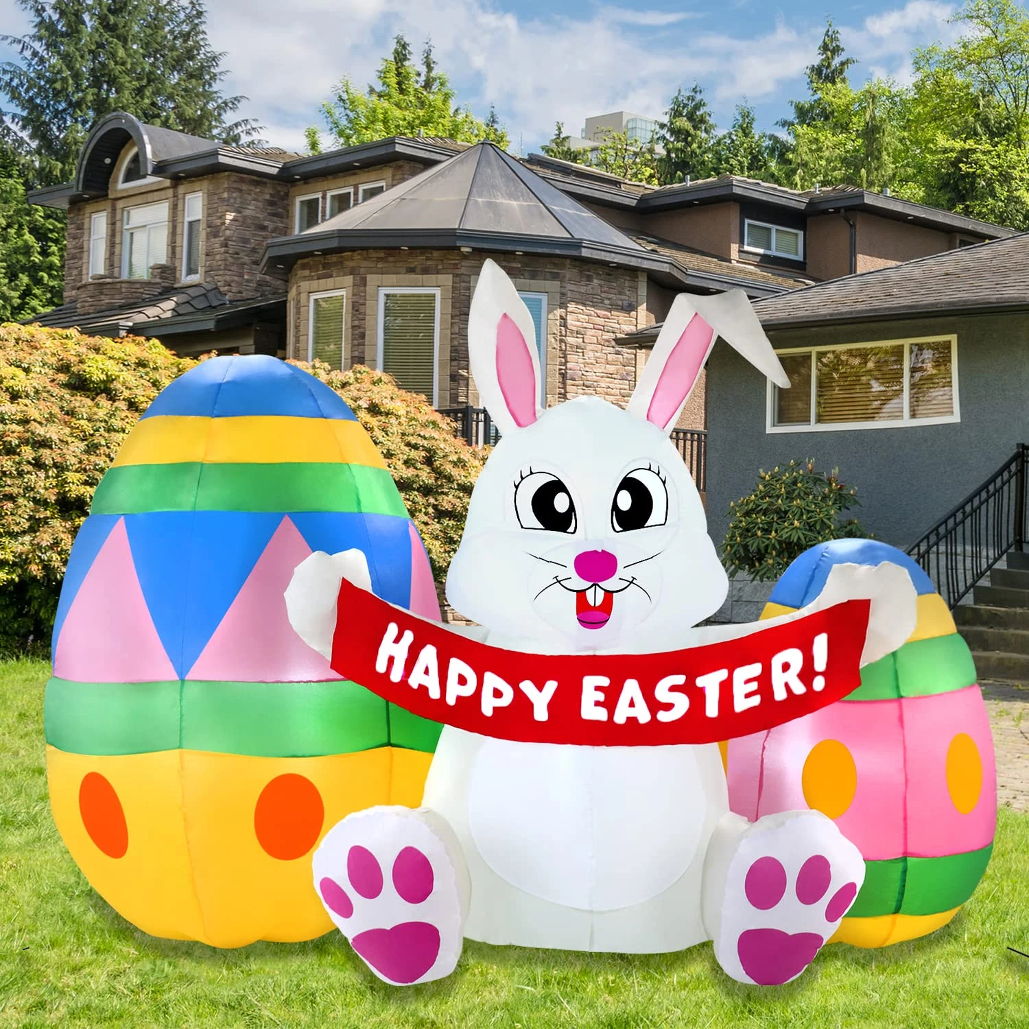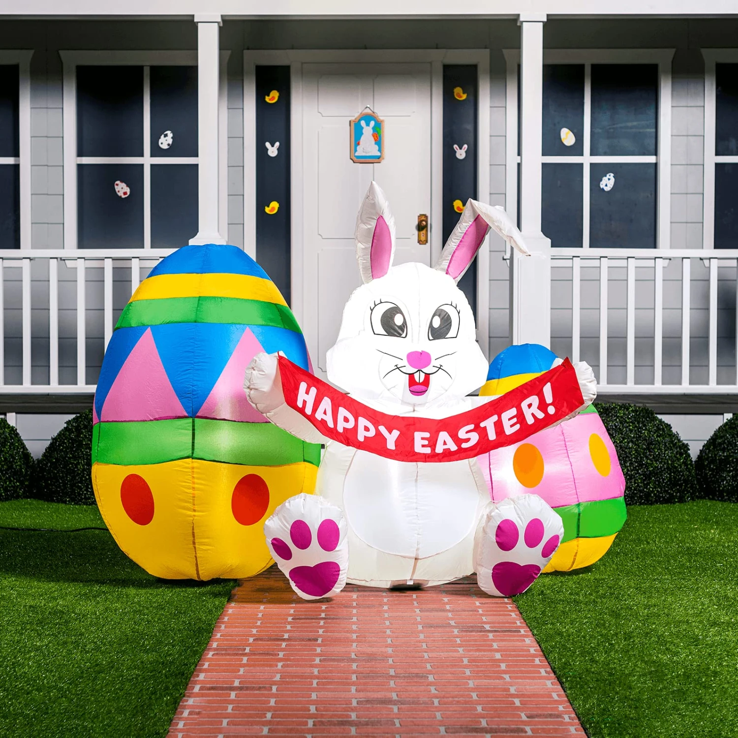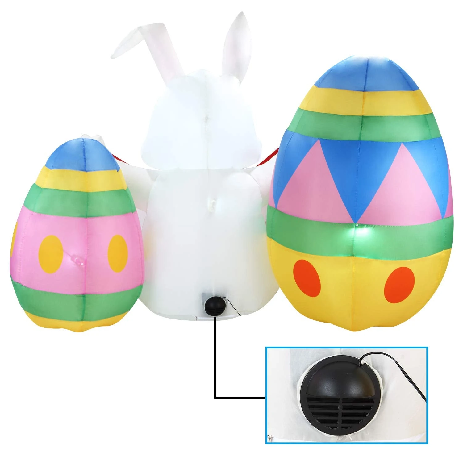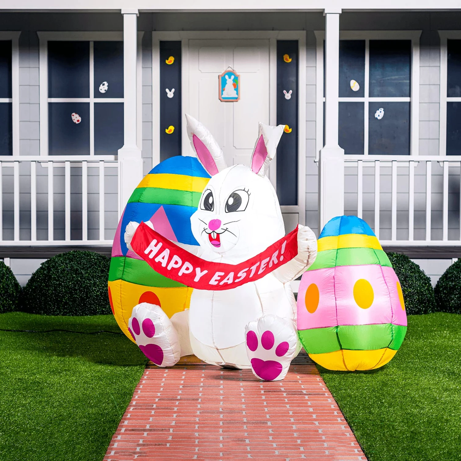 - 6 Feet Tall Easter Bunny Decor Inflatable comes with an extended cord, ground stakes, fastened ropes, built-in sandbags, and a plug with UL certification.