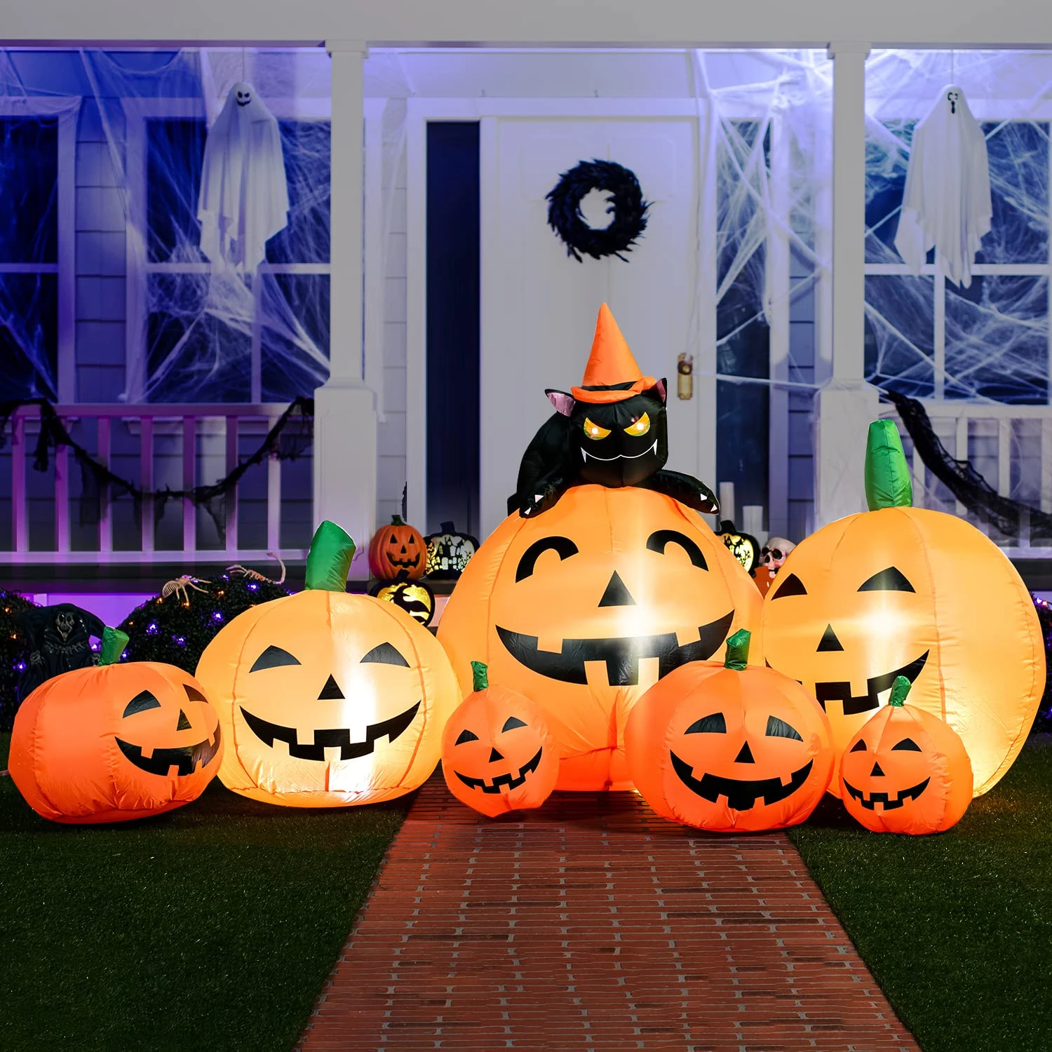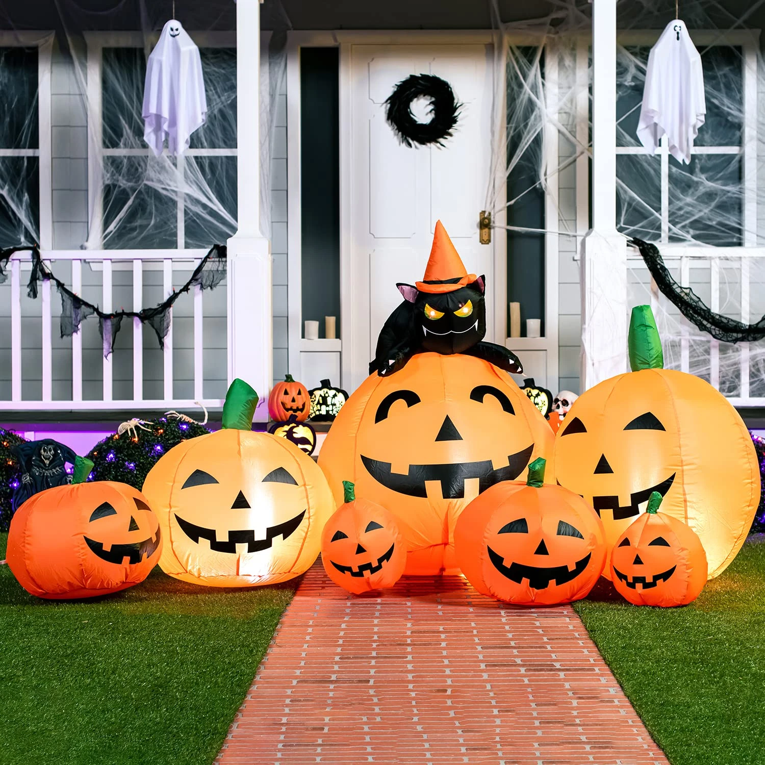 - Our 7 ft Long Spooky Inflatable Pumpkin with Witch’s Cat on Top. Ideal Halloween blow up Yard Decorations comes in 10ft extended cord, ground stakes, fastened ropes, and built in sandbags. Plug in,