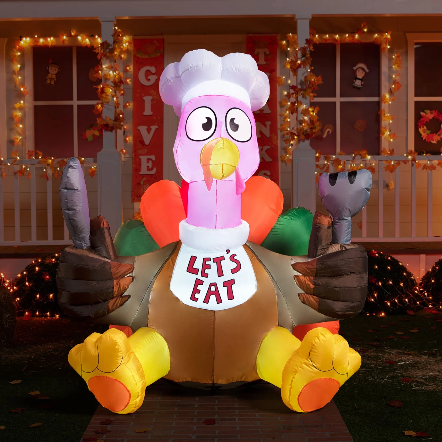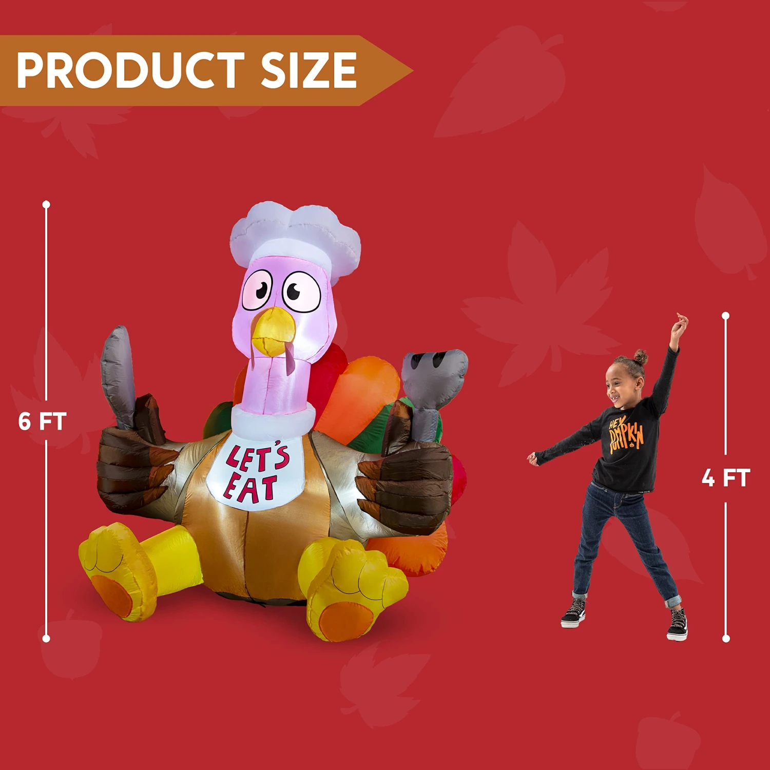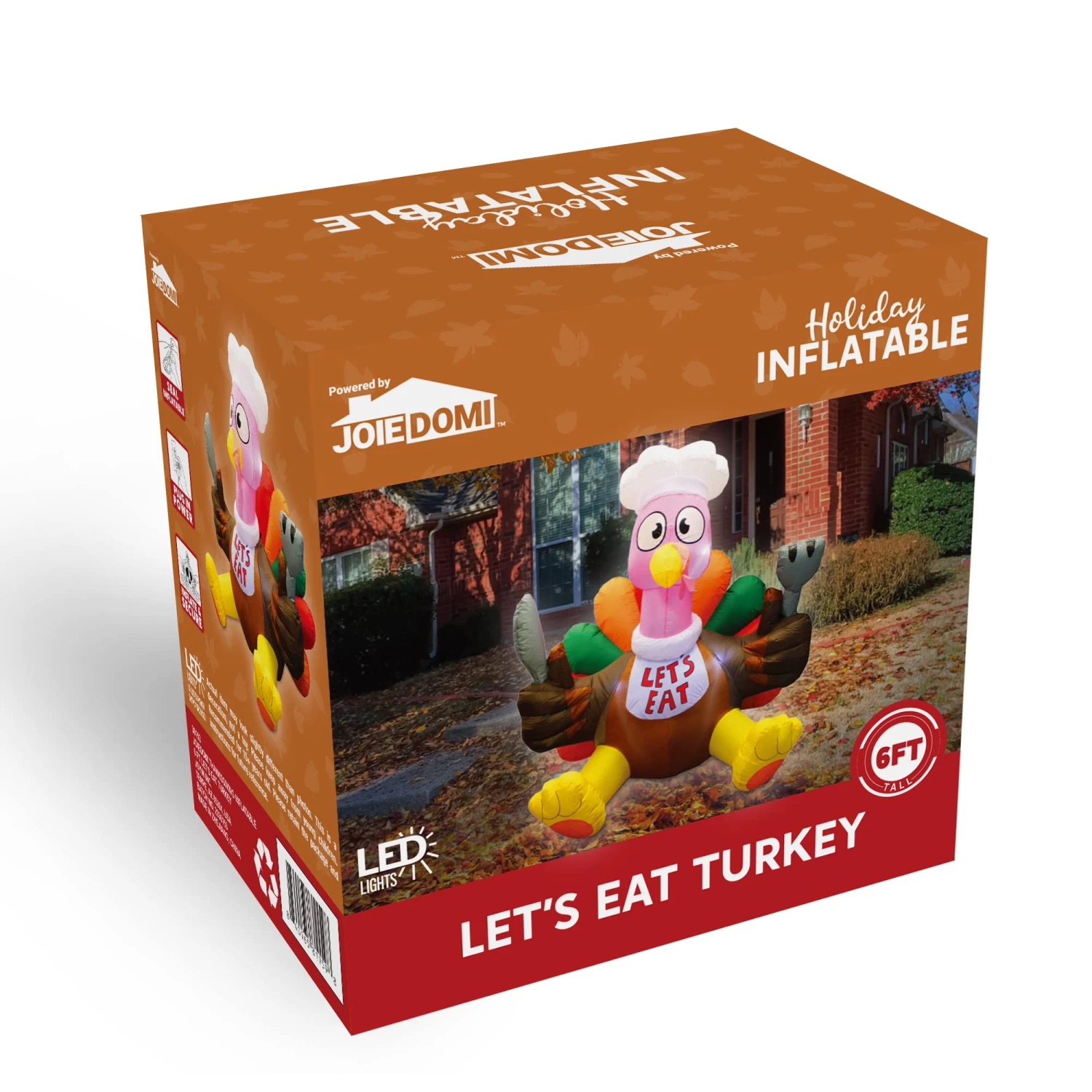 - 6 Feet Tall Let’s Eat Turkey Inflatable comes with an extended cord, ground stakes, fastened ropes, built-in sandbags, and a plug with UL certification.