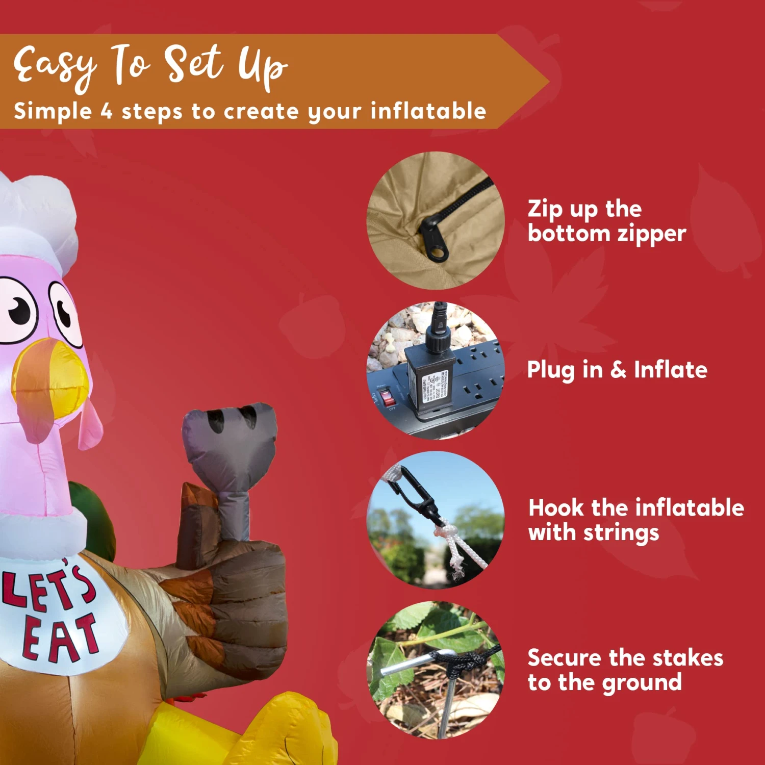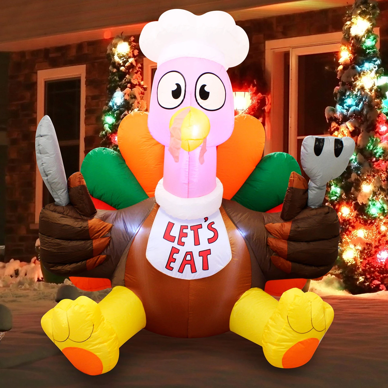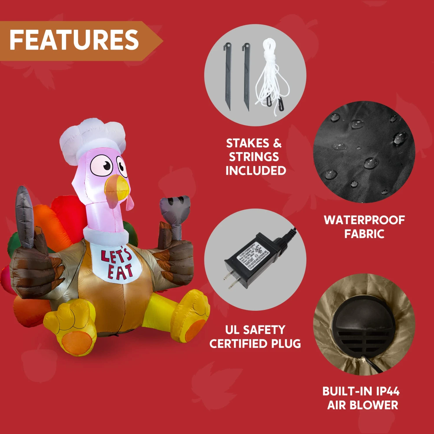 - 6 Feet Tall Let’s Eat Turkey Inflatable comes with an extended cord, ground stakes, fastened ropes, built-in sandbags, and a plug with UL certification.