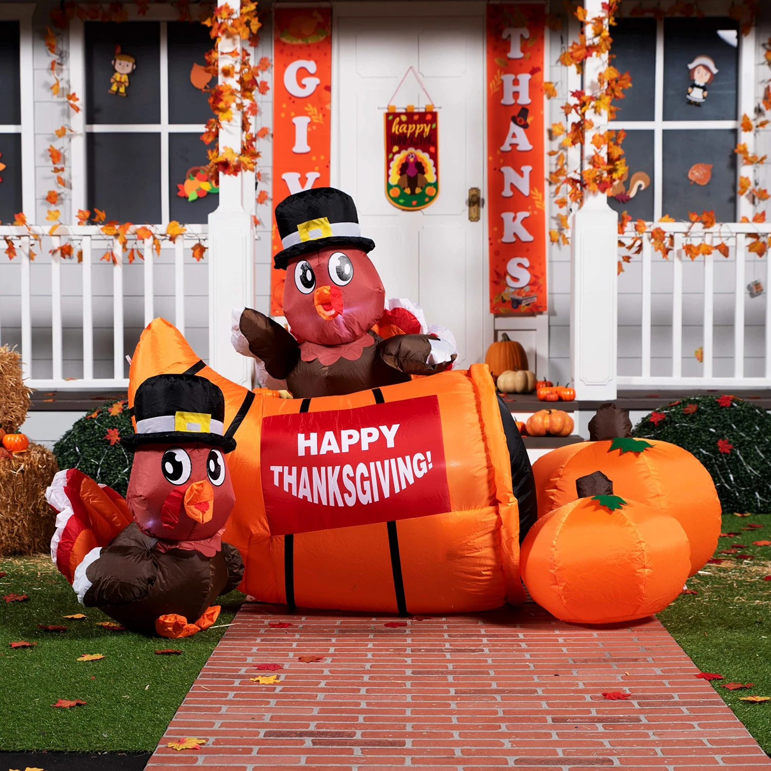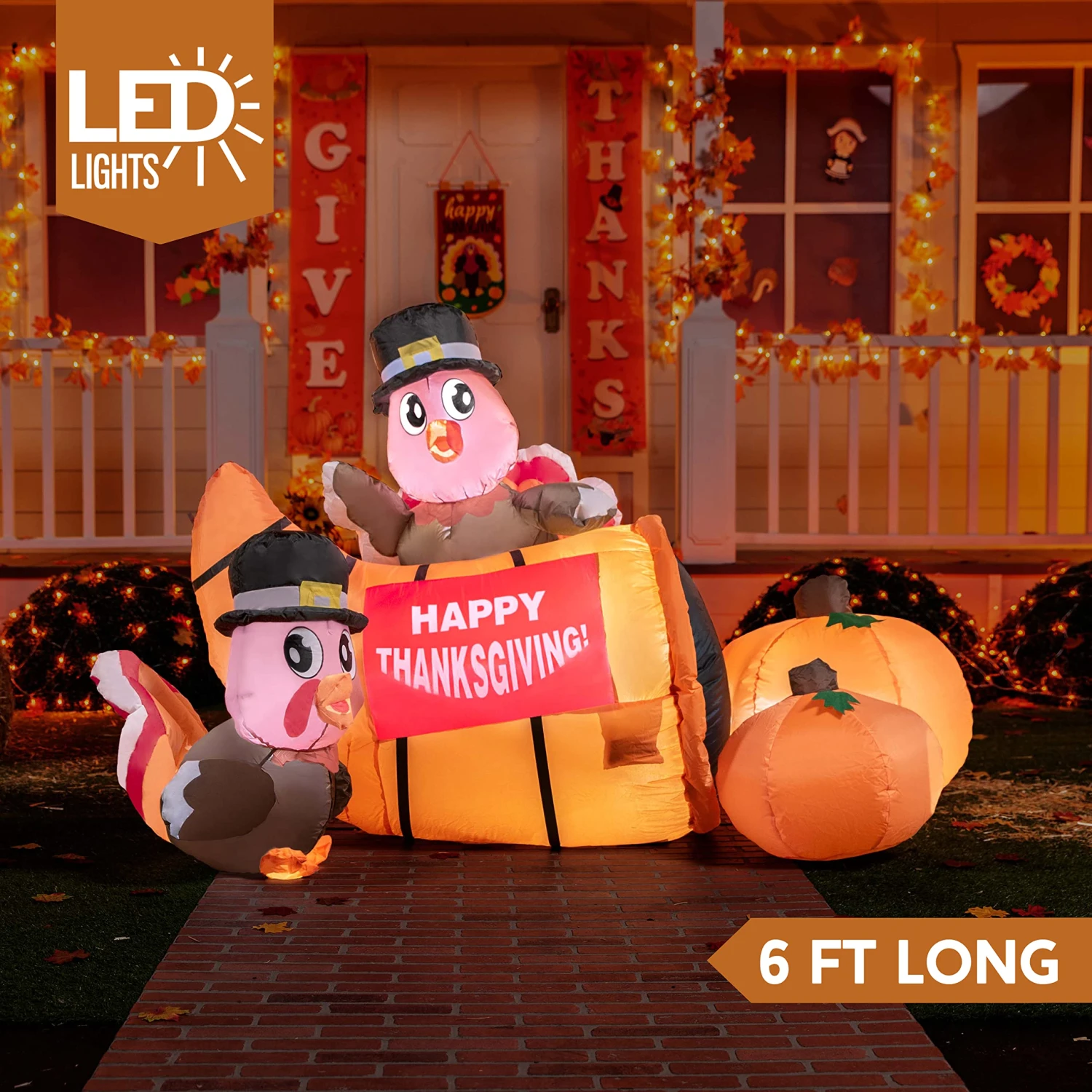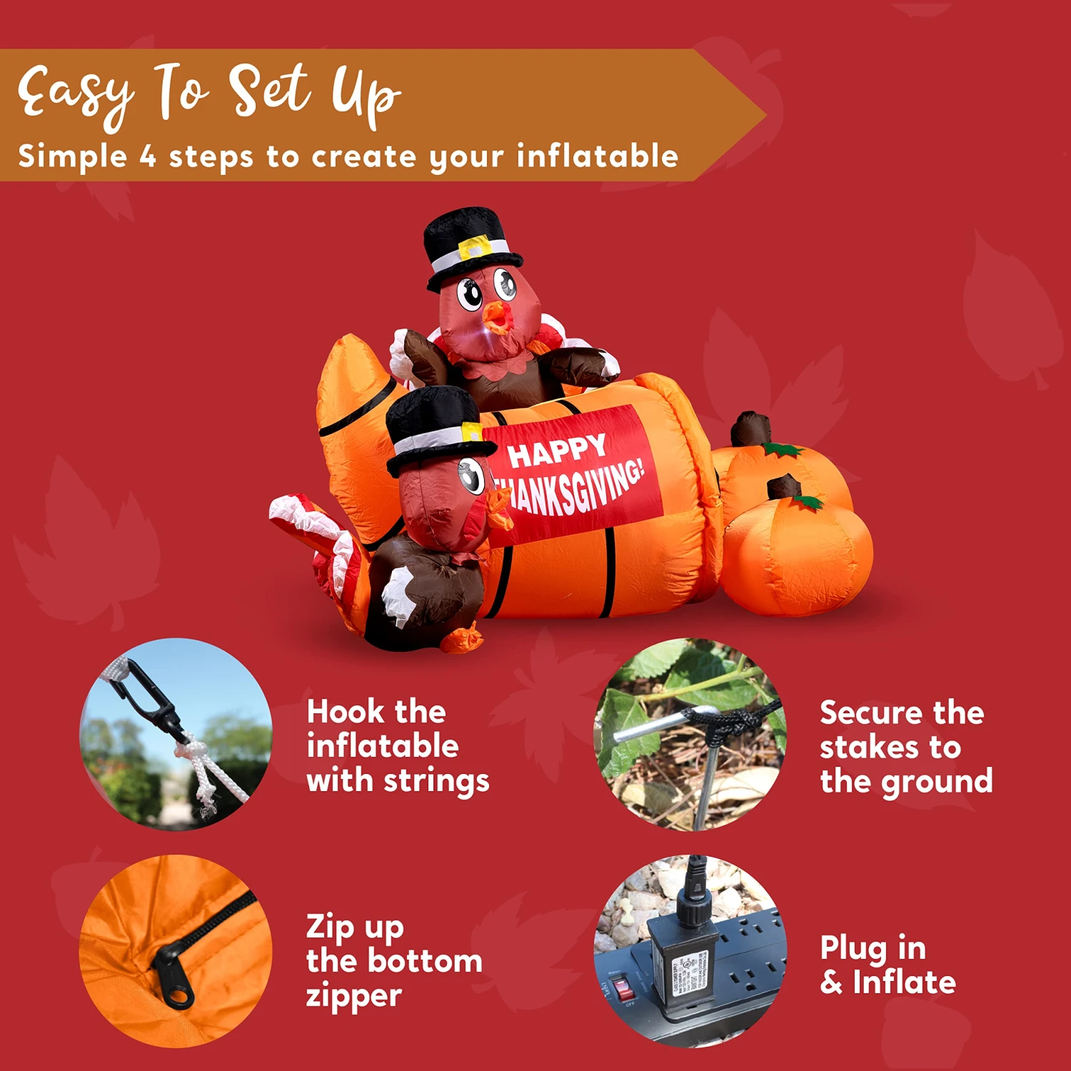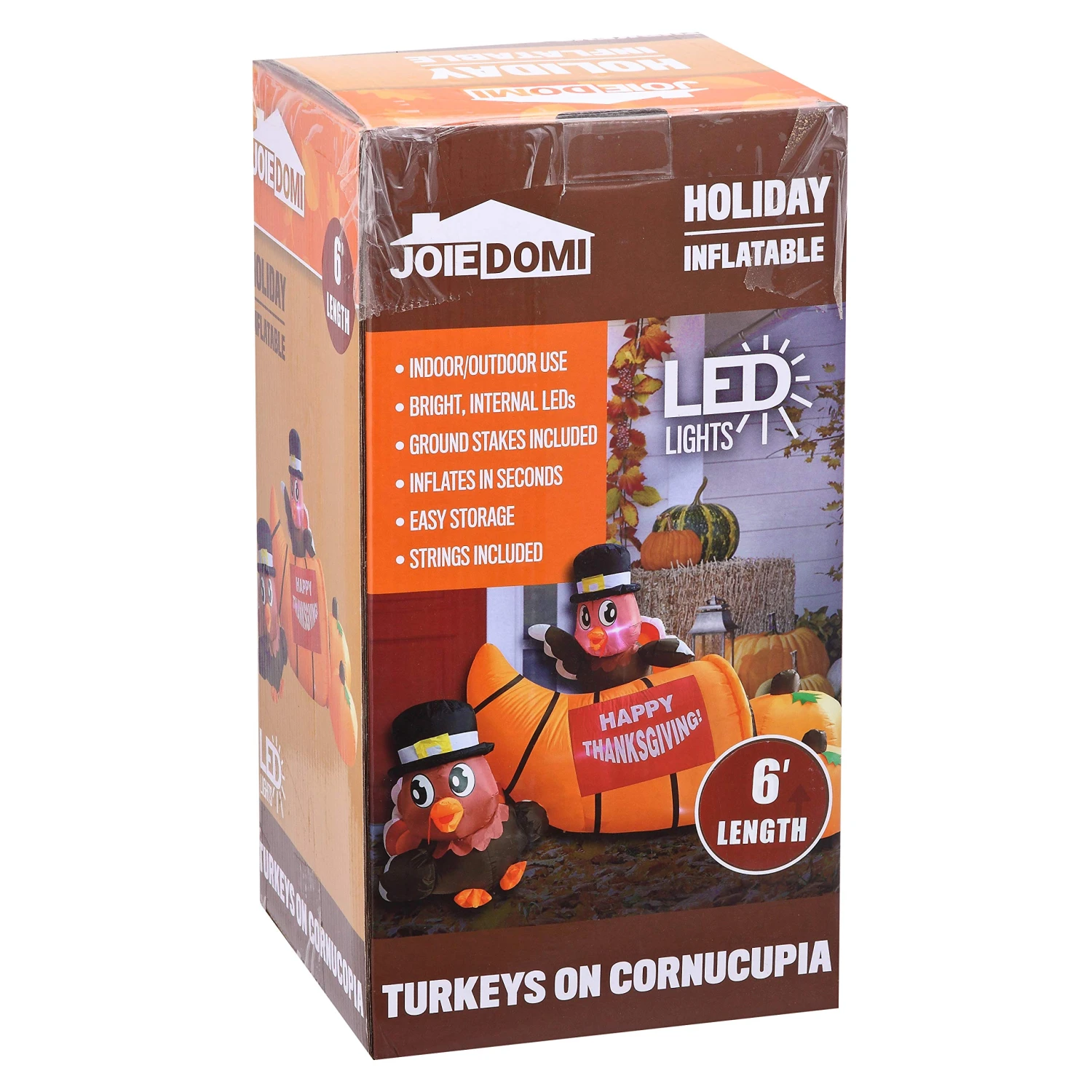 - 6 Feet long Turkey Cornucopia Inflatable comes with an extended cord, ground stakes, fastened ropes, built-in sandbags, and a plug with UL certification.