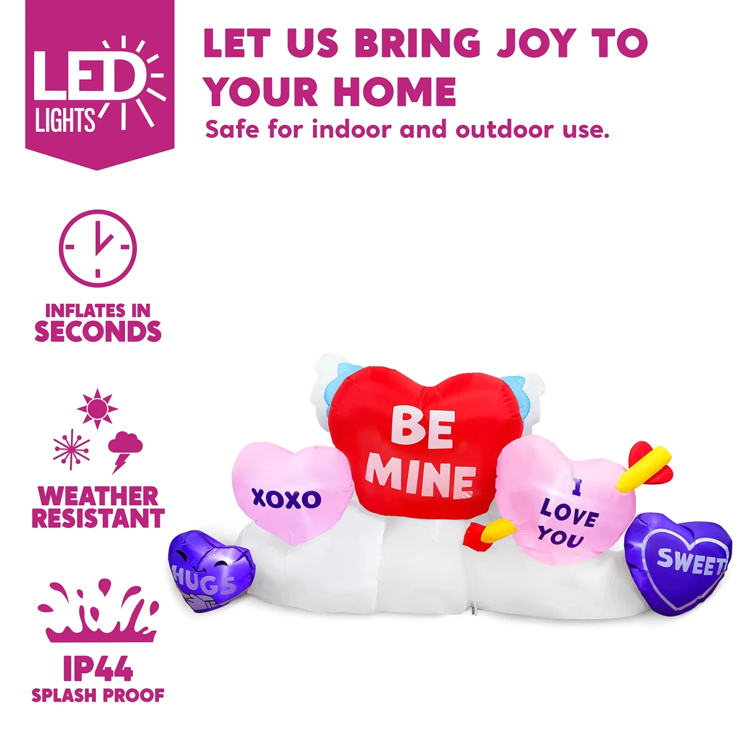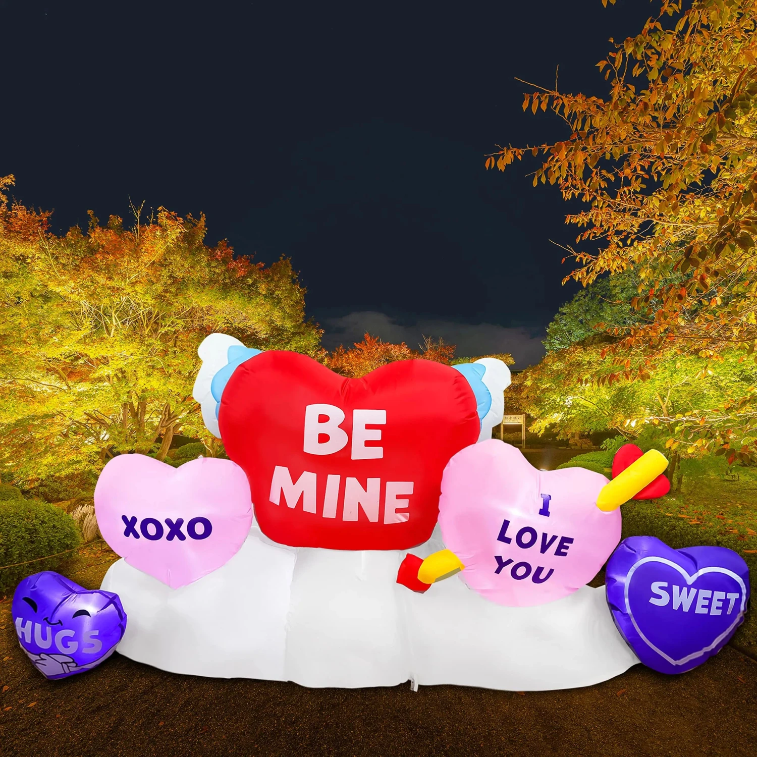 - 6 feet long hearts patch valentine inflatable comes with an extended cord, ground stakes, fastened ropes, built-in sandbags, and a plug with UL certification.