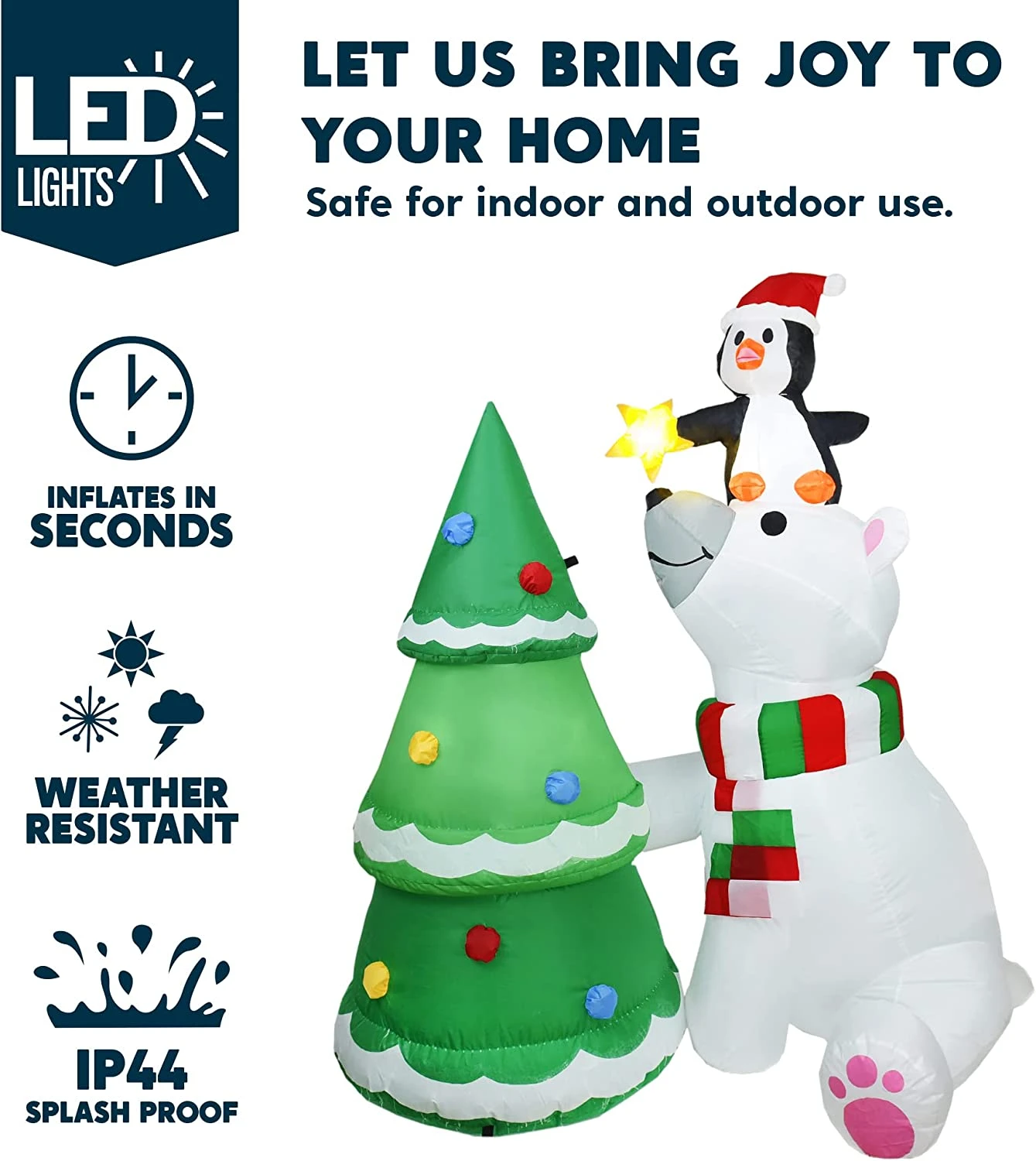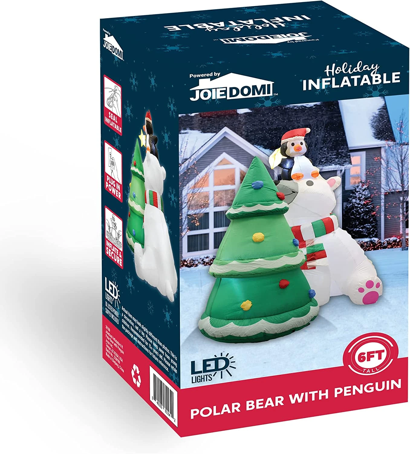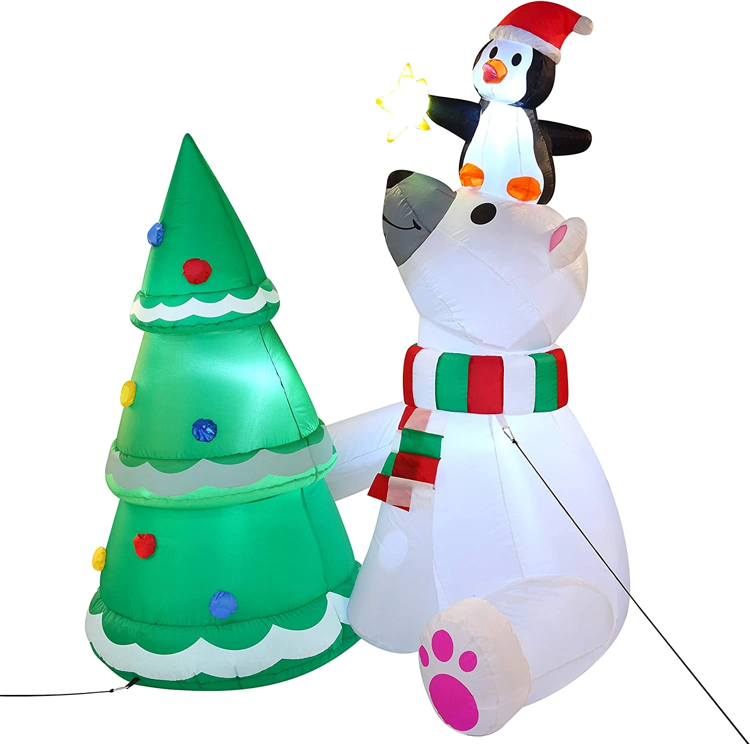 - 6 ft Tall Polar Bear Christmas Tree Inflatable comes with an extended cord, ground stakes, fastened ropes, built-in sandbags, and a plug with UL certification.