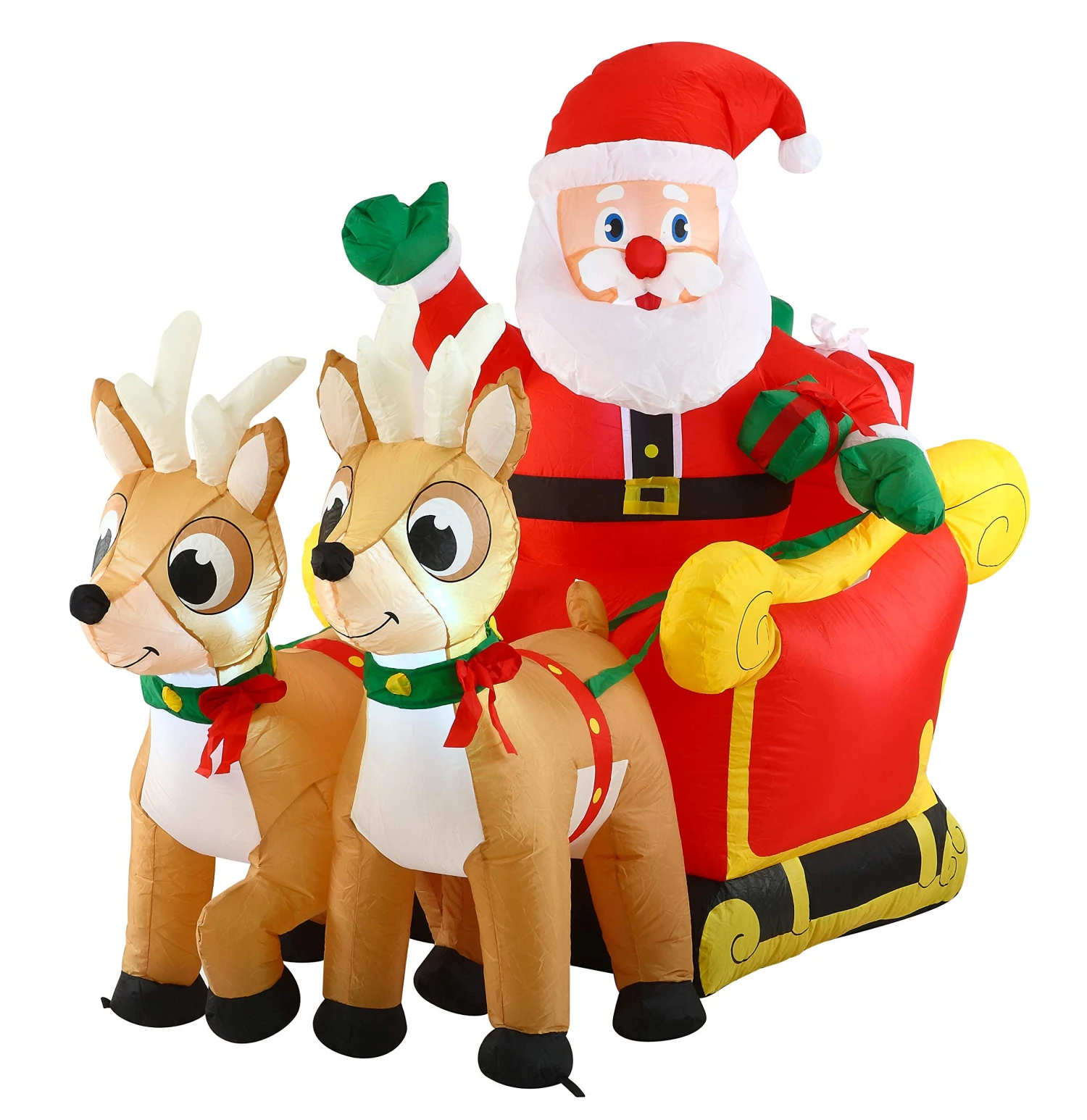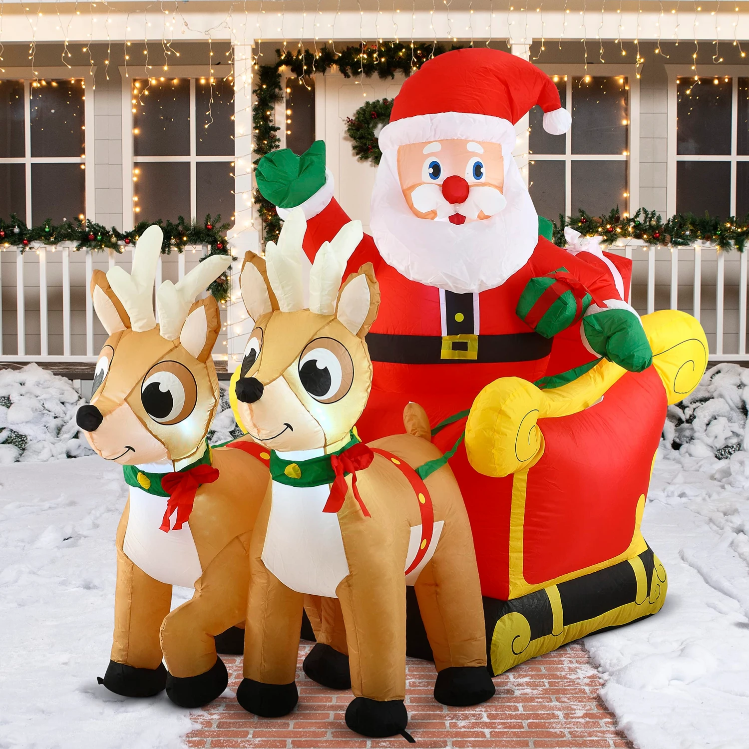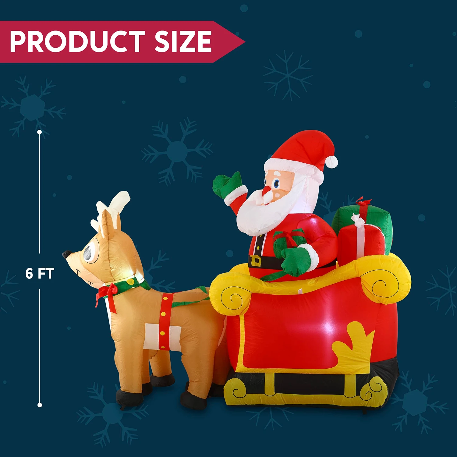 - Our 6 Feet Tall Santa Deer Sleigh Ride Inflatable includes an extended cord, ground stakes, fastened ropes, built-in sandbags, and a plug with UL certification.
