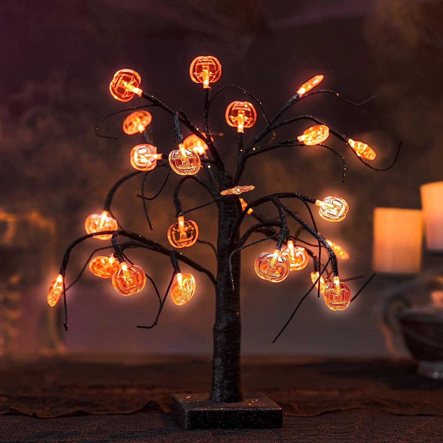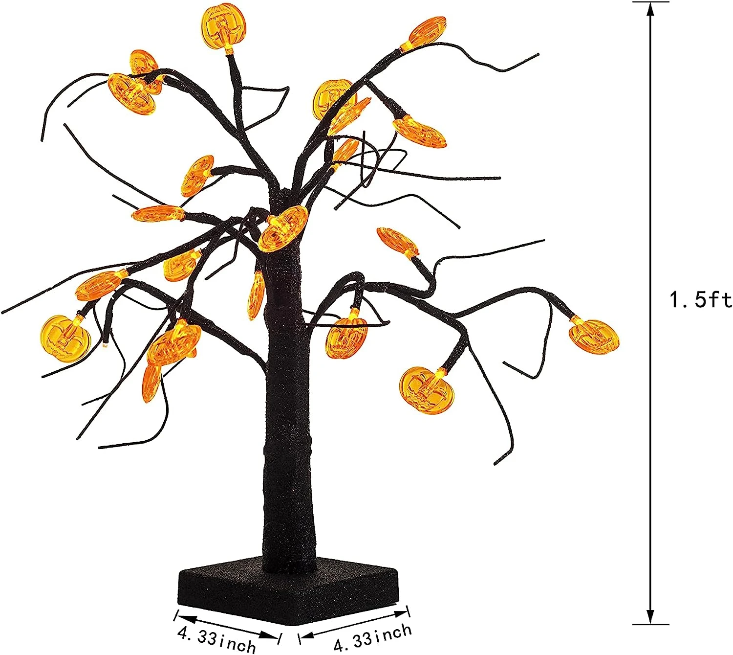 - This Halloween tree decor is uniquely designed with glittered LED lights and pumpkin lights on twigs. The Halloween tree’s energy-saving LED lights cast a stunning glow and create a Halloween holiday atmosphere by generating a sparkling lighting effect.