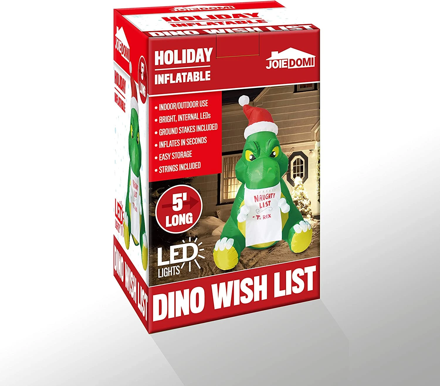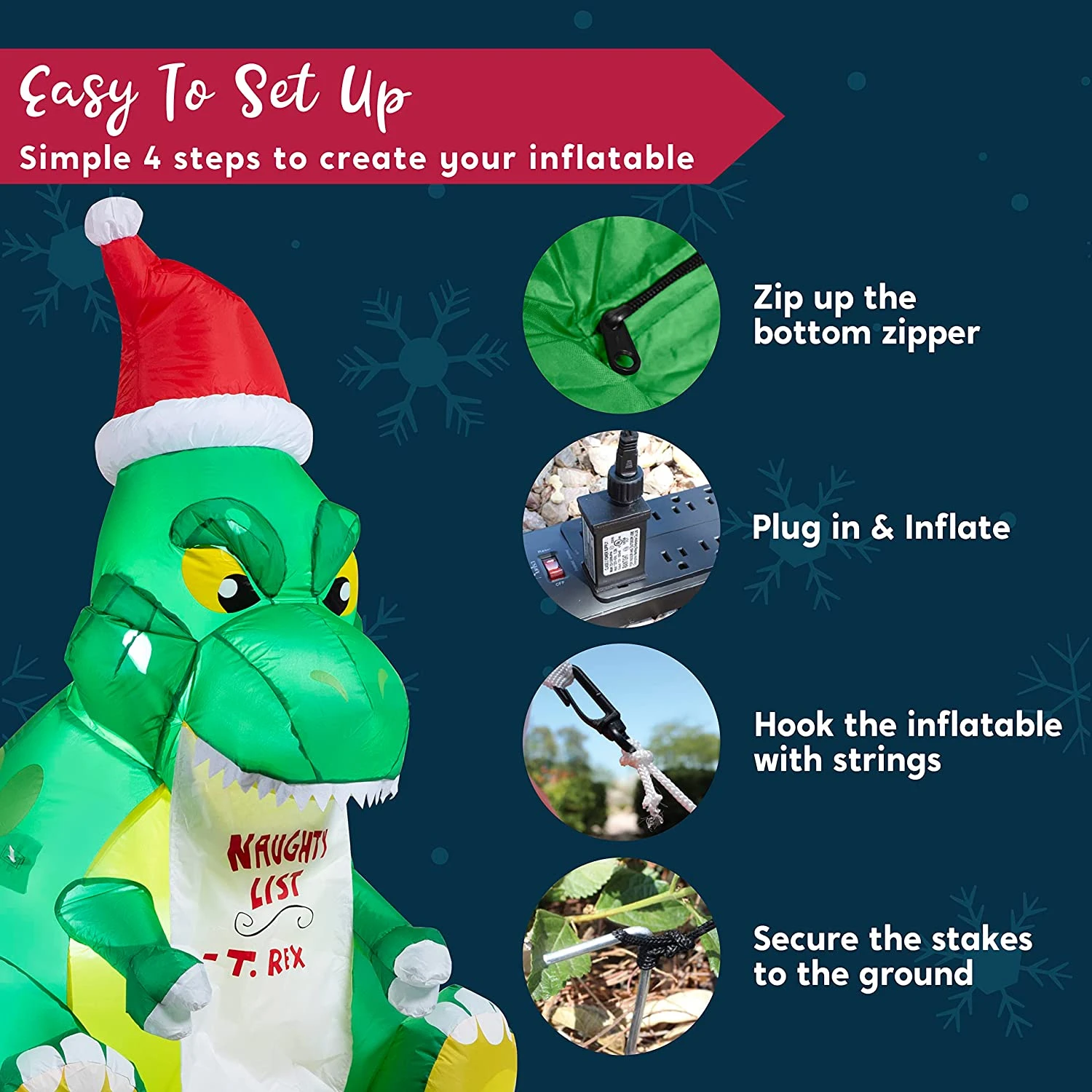 - 5 ft. Long Sitting Dinosaur Inflatable comes with an extended cord, ground stakes, fastened ropes, built-in sandbags, and a plug with UL certification.