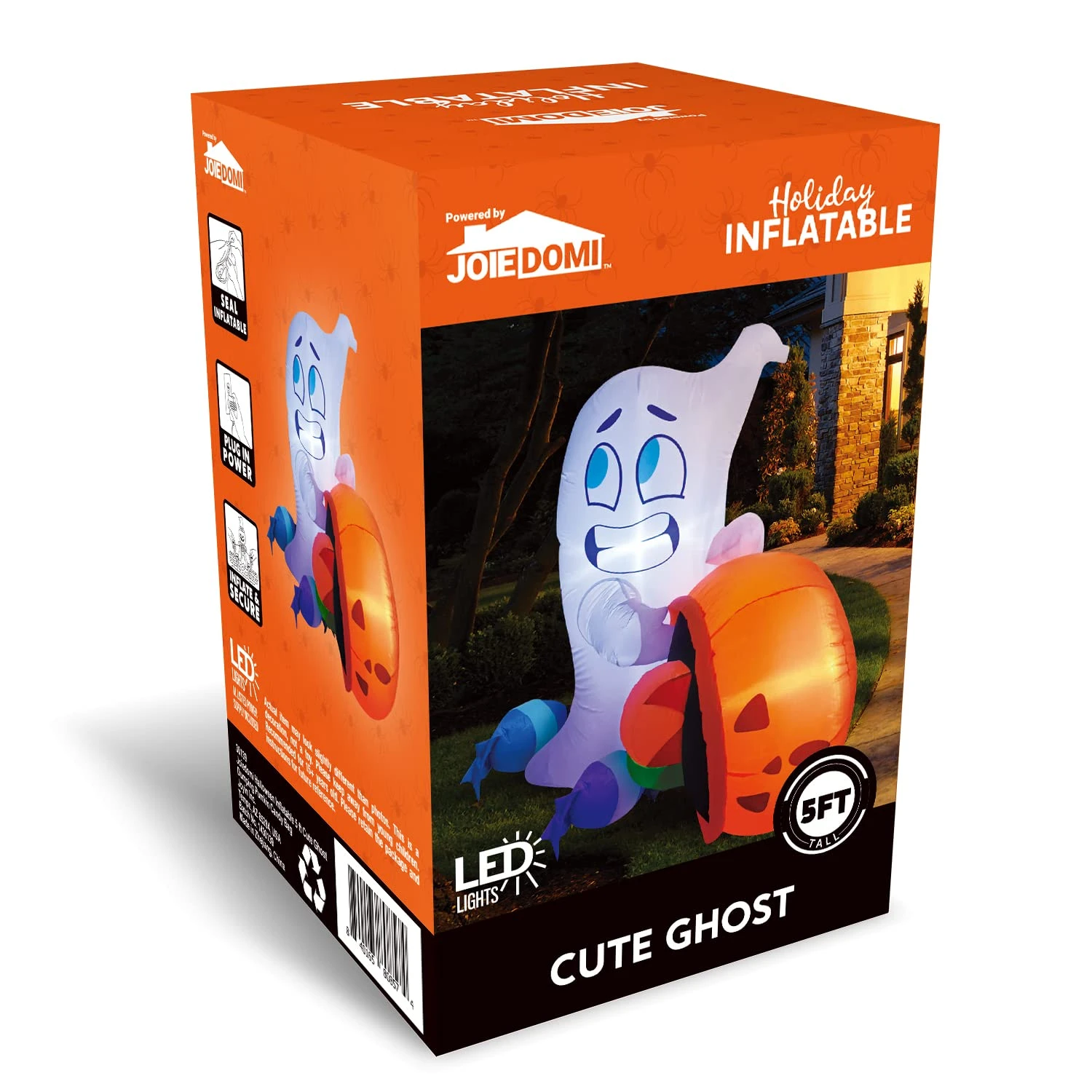- Our 5 ft tall Halloween Cute Ghost Dump Pumpkin Candy Bag Inflatable comes with an extended cord, ground stakes, fastened ropes, built-in sandbags, and a plug with UL certification. These features help secure the ghost in place, preventing it from being blown away by wind outdoors.